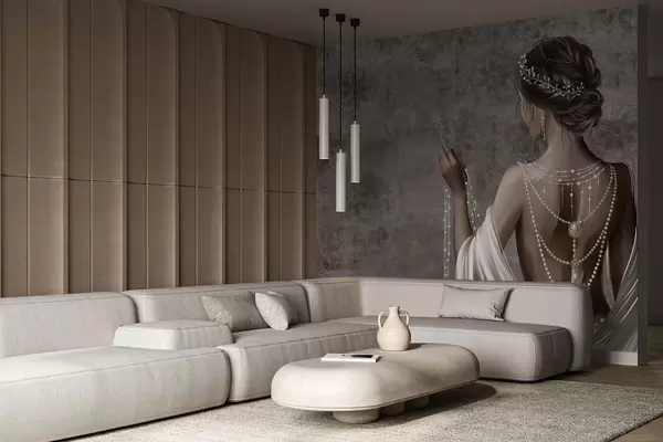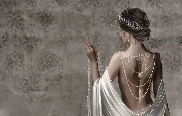 Woman seen from behind with pearls, gray stone-patterned backdrop - Wall mural (No. w04854)