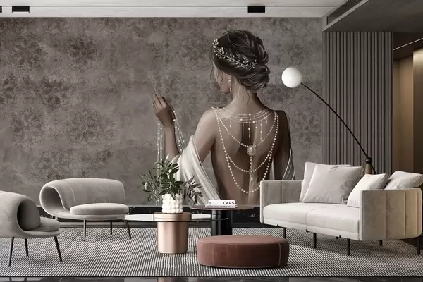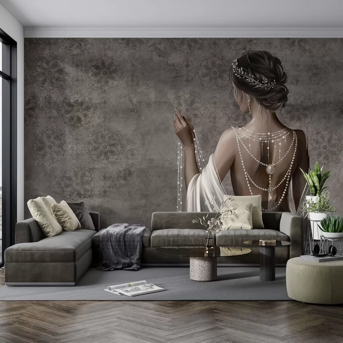 Woman seen from behind with pearls, gray stone-patterned backdrop - Wall mural (No. w04854)