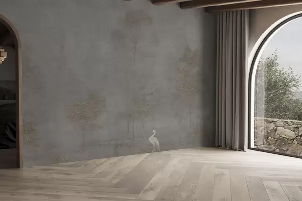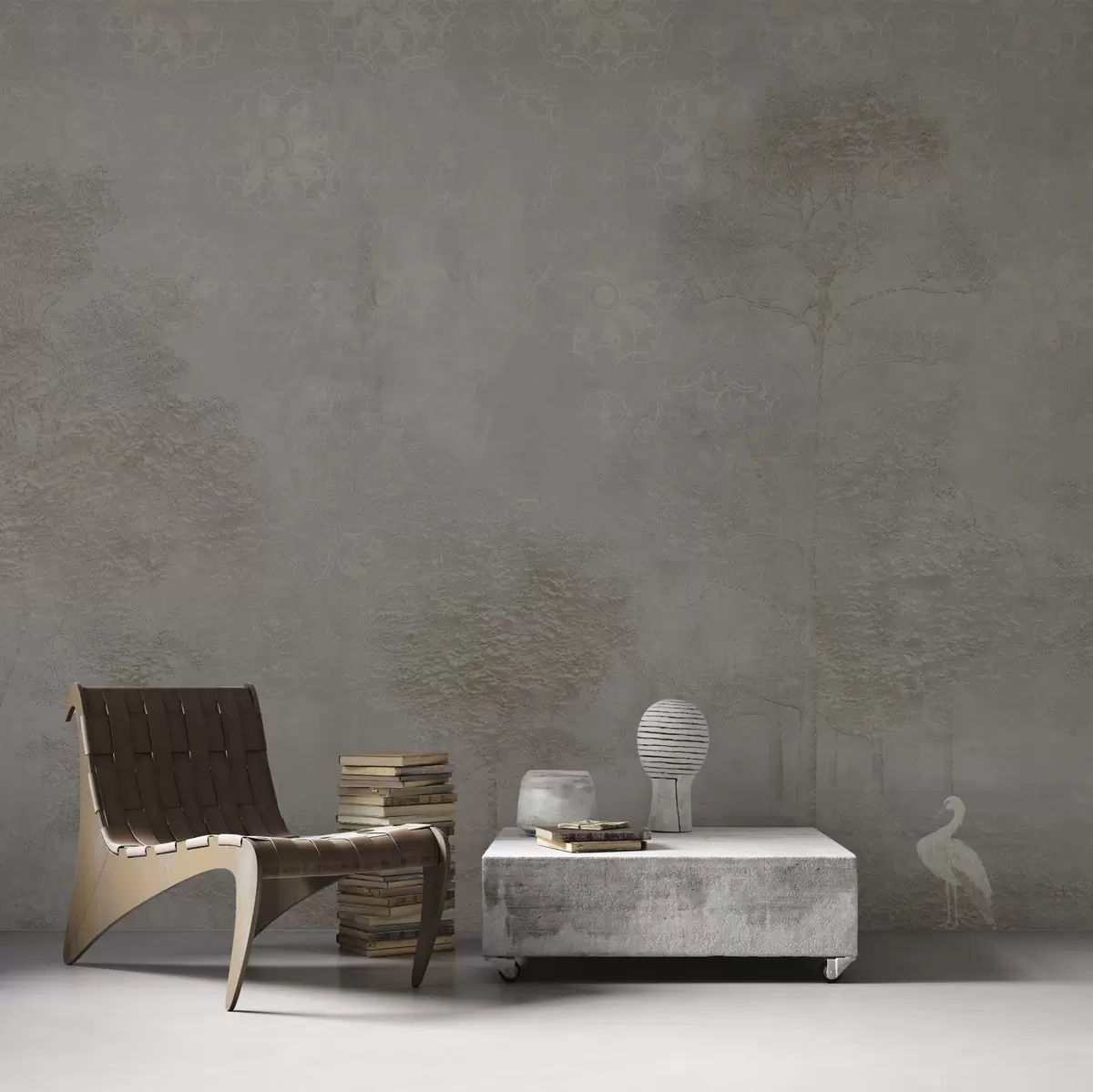 Misty forest with a heron and an ornamental pattern above - Wall mural (No. w04953v1)