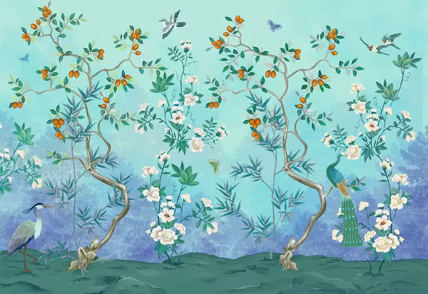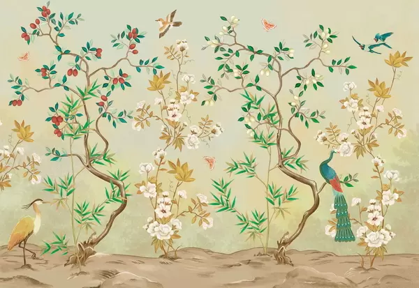 Decorative scene with trees, flowers and birds on dark background - Wall mural (No. w05004)