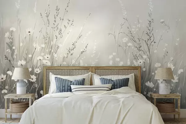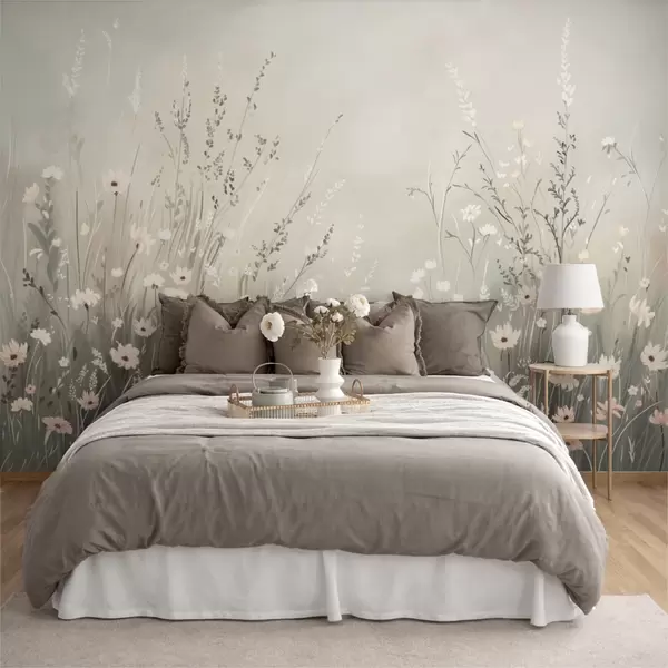 Soft meadow scene with white flowers and delicate grasses - Wall mural (No. w05015v1)