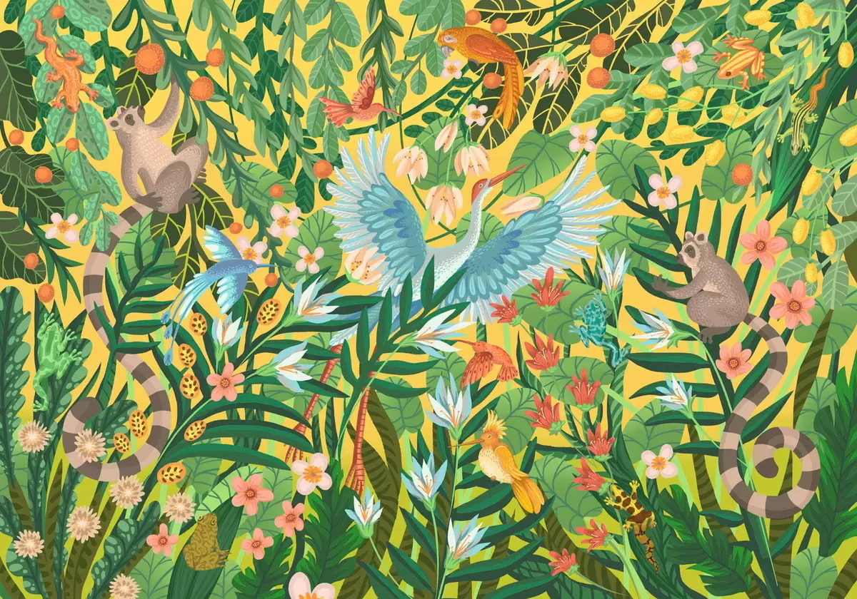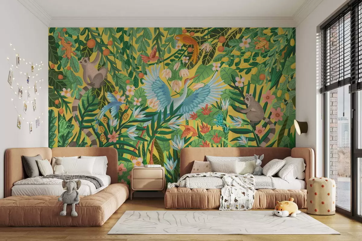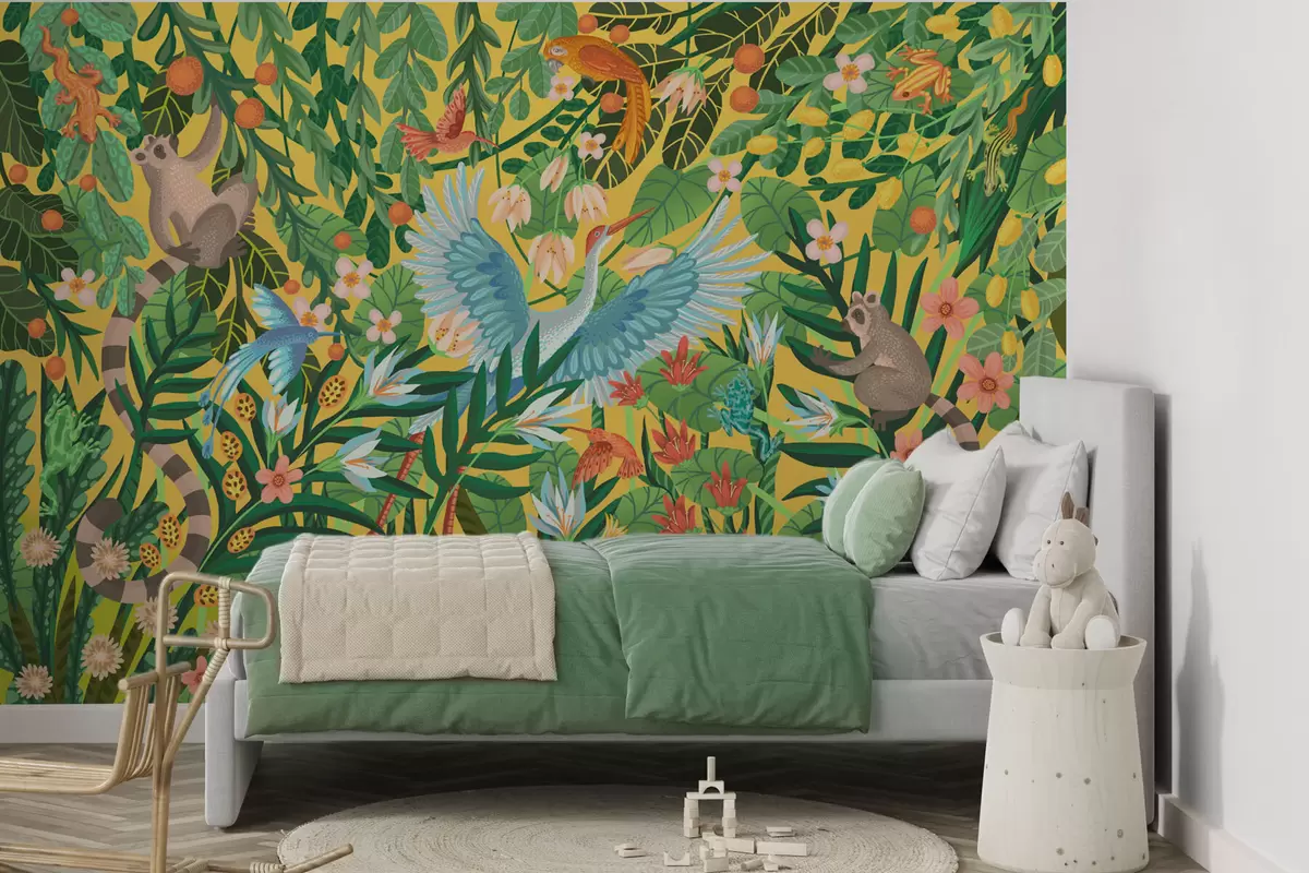 Bright scene with birds and animals in dense greenery - Wall mural (No. w05024v1)