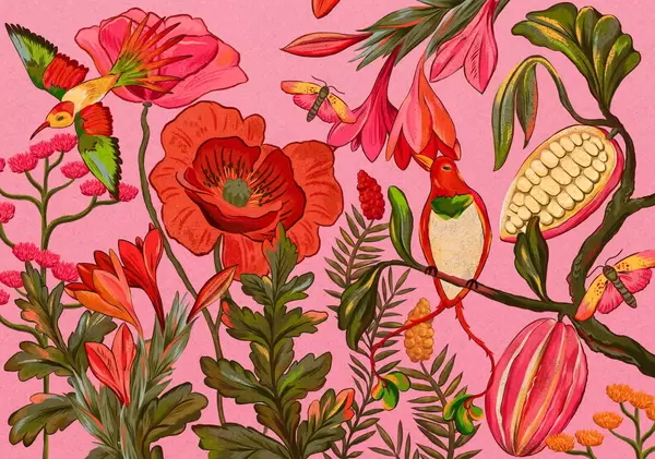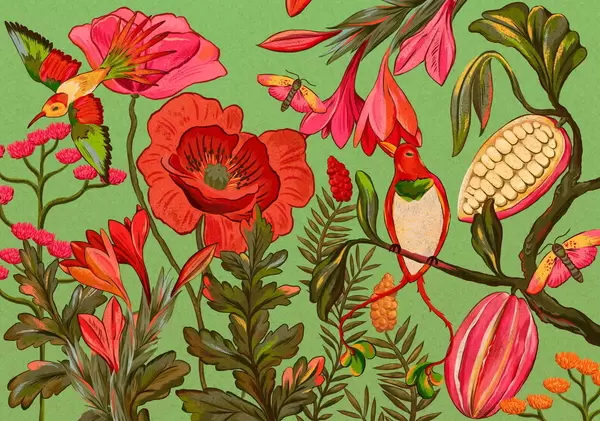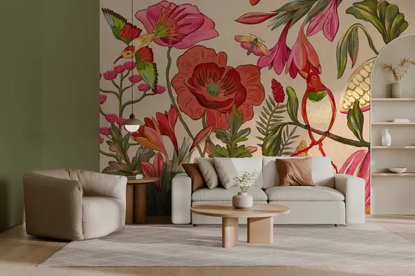 Decorative flowers and birds on blue background - Wall mural (No. w05036)