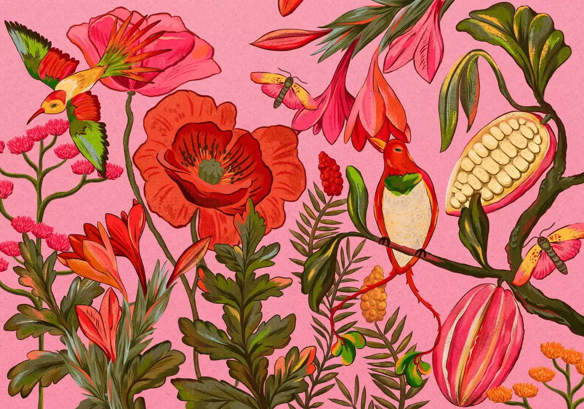 Decorative flowers and birds on pink background - Wall mural (No. w05036v2)