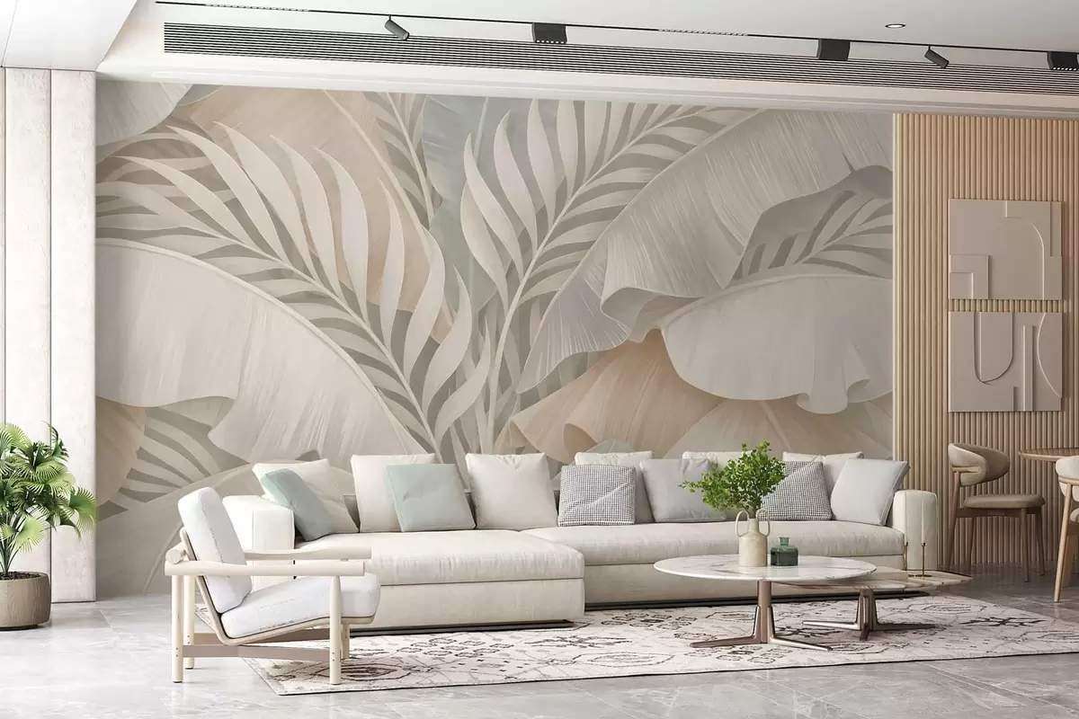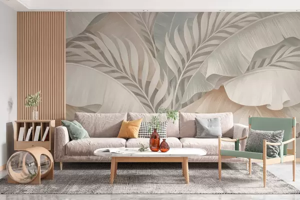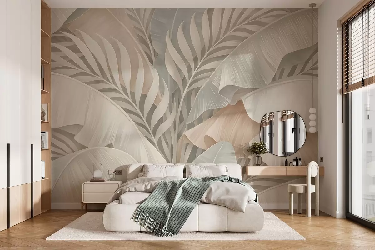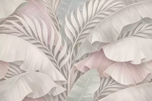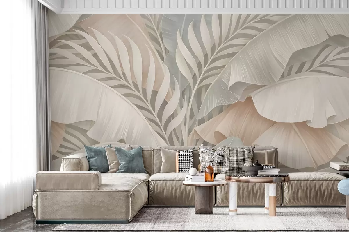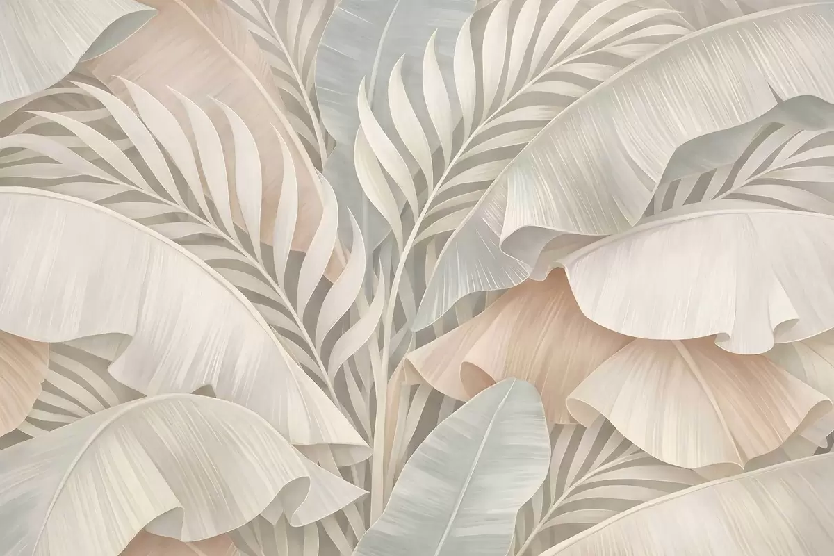 large tropical leaves in shades of peach and dull turquoise - Wall mural (No. w05062)