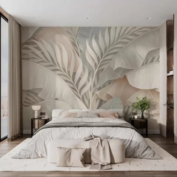 large tropical leaves in shades of peach and dull turquoise - Wall mural (No. w05062)