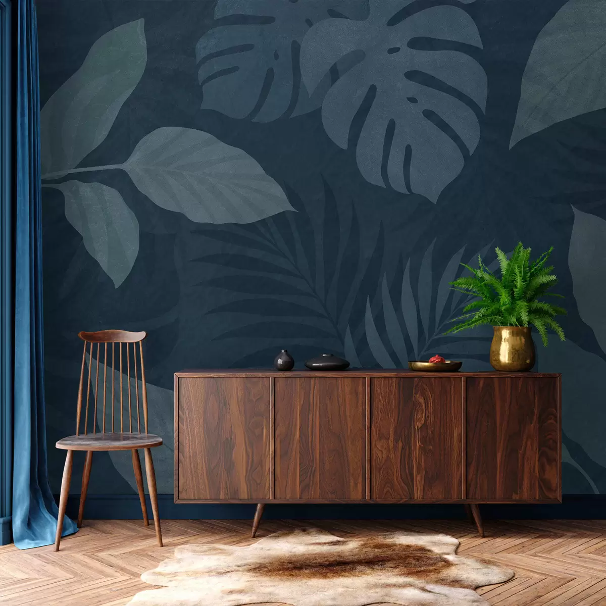 textured tropical leaves on a dark blue background - Wall mural (No. w05063v3)