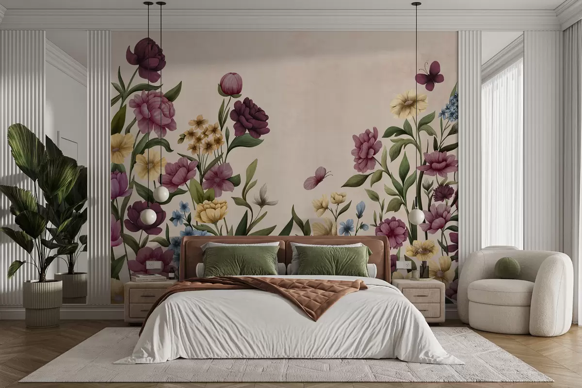 Floral composition with plants and butterflies on light background - Wall mural (No. w05072)