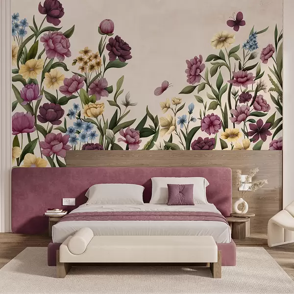 Floral composition with plants and butterflies on light background - Wall mural (No. w05072)