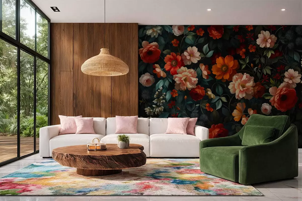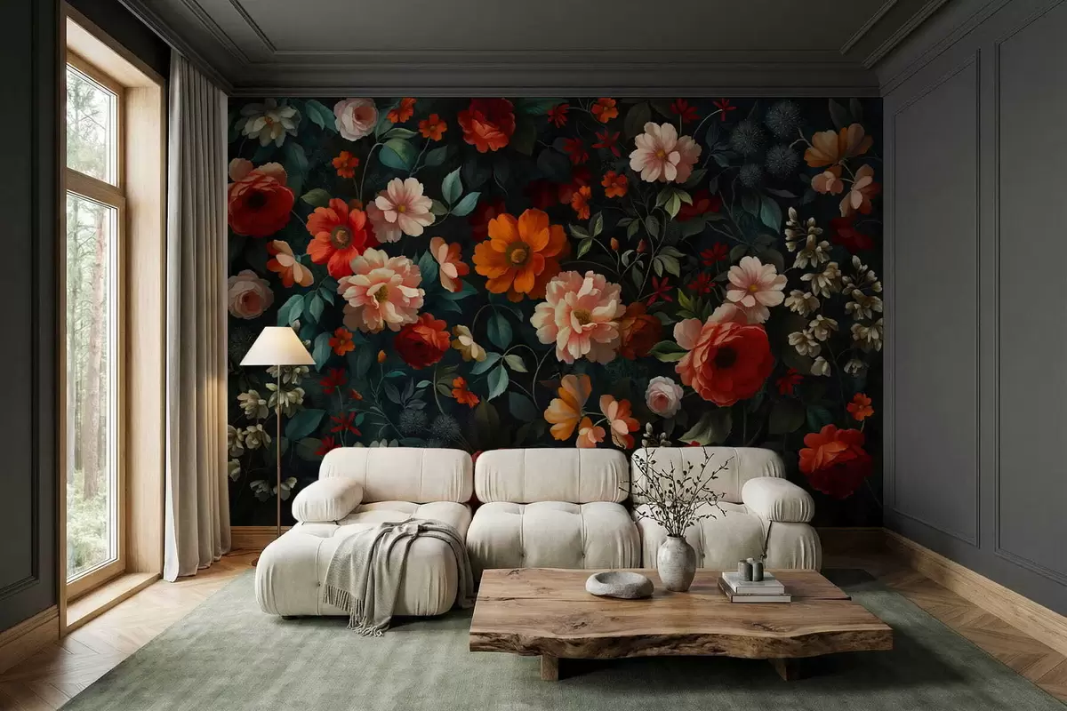 Dark floral pattern with lush garden flowers - Wall mural (No. w05087)