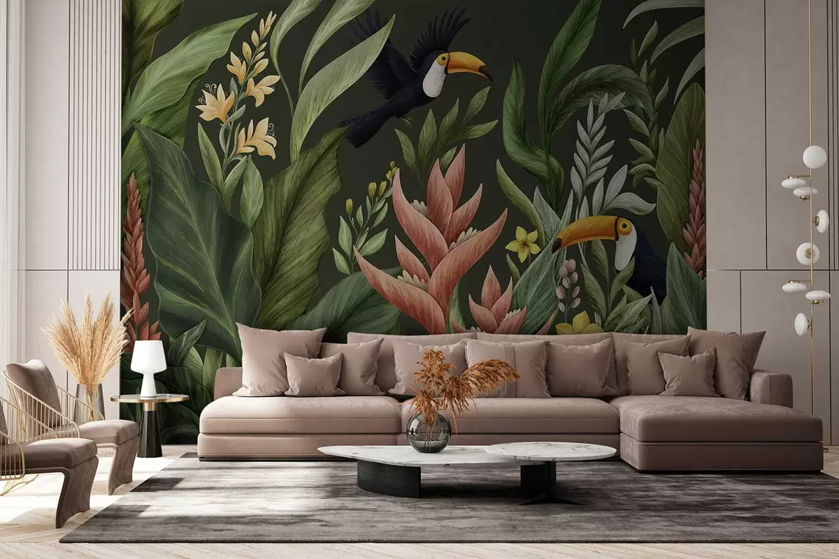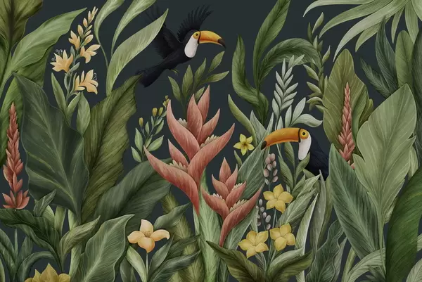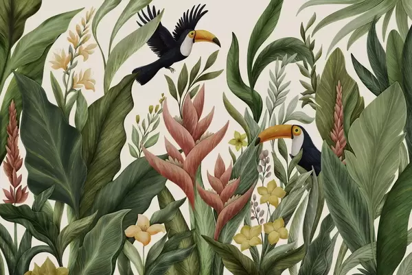 Tropical plants and large-beaked birds on light background - Wall mural (No. w05088)