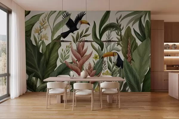 Tropical plants and large-beaked birds on light background - Wall mural (No. w05088v1)
