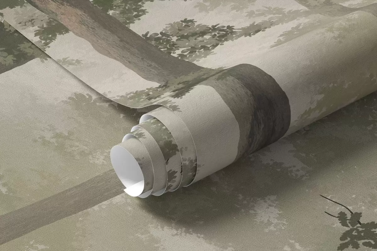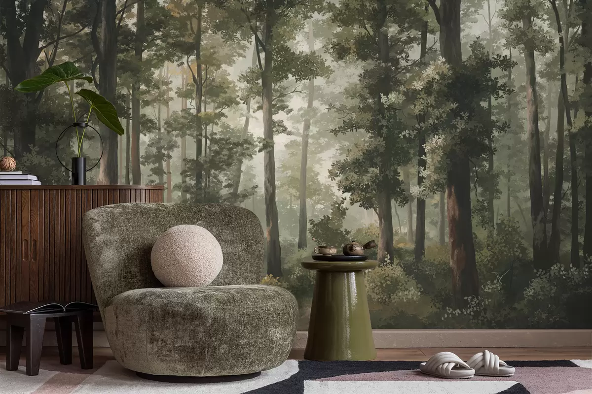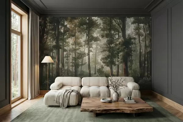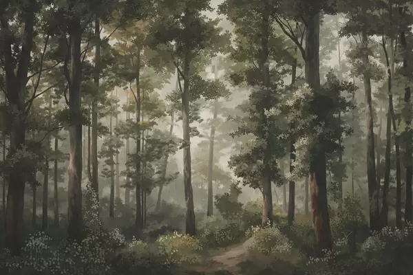 Forest illustration with mist, tall trees and a path - Wall mural (No. w05089)