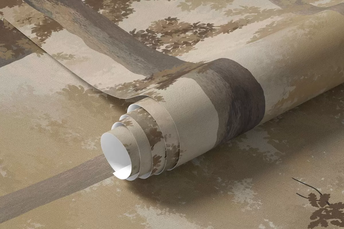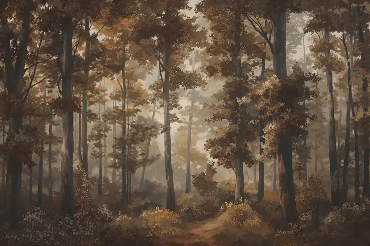 Autumn forest scene with warm light and dense trees - Wall mural (No. w05089v1)