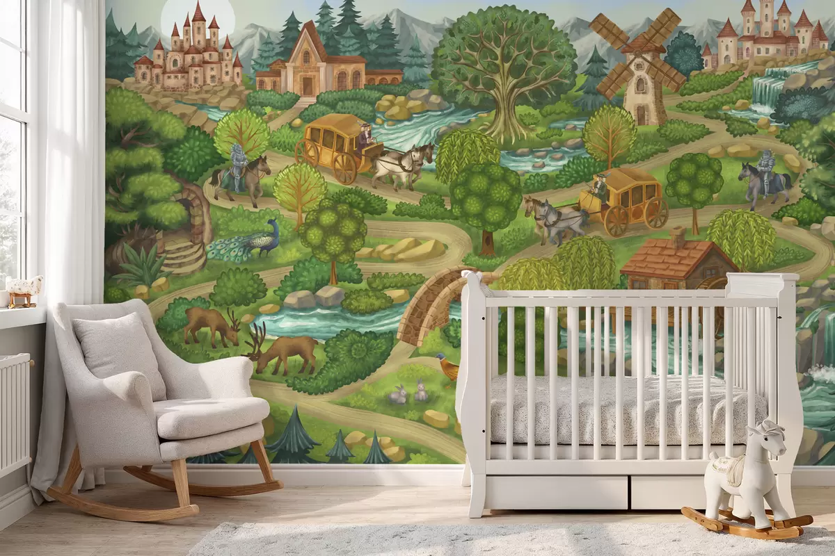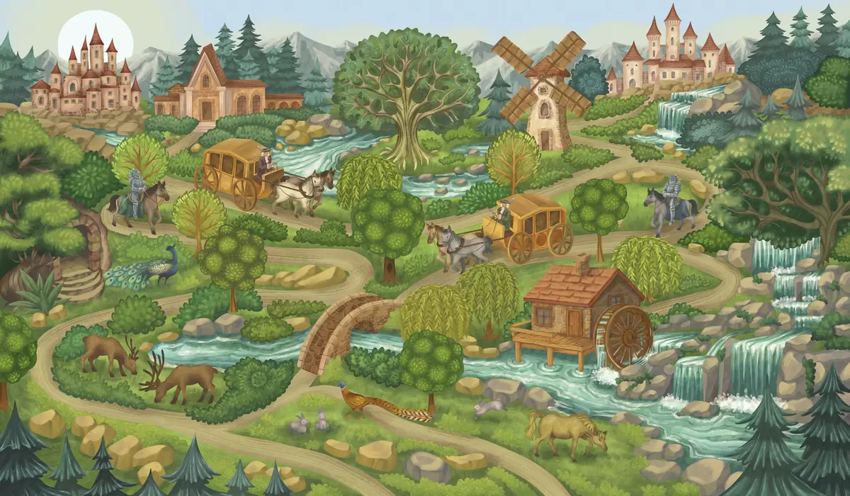 Fairy illustration with castles, forest, rivers and travelers - Wall mural (No. w05091v1)