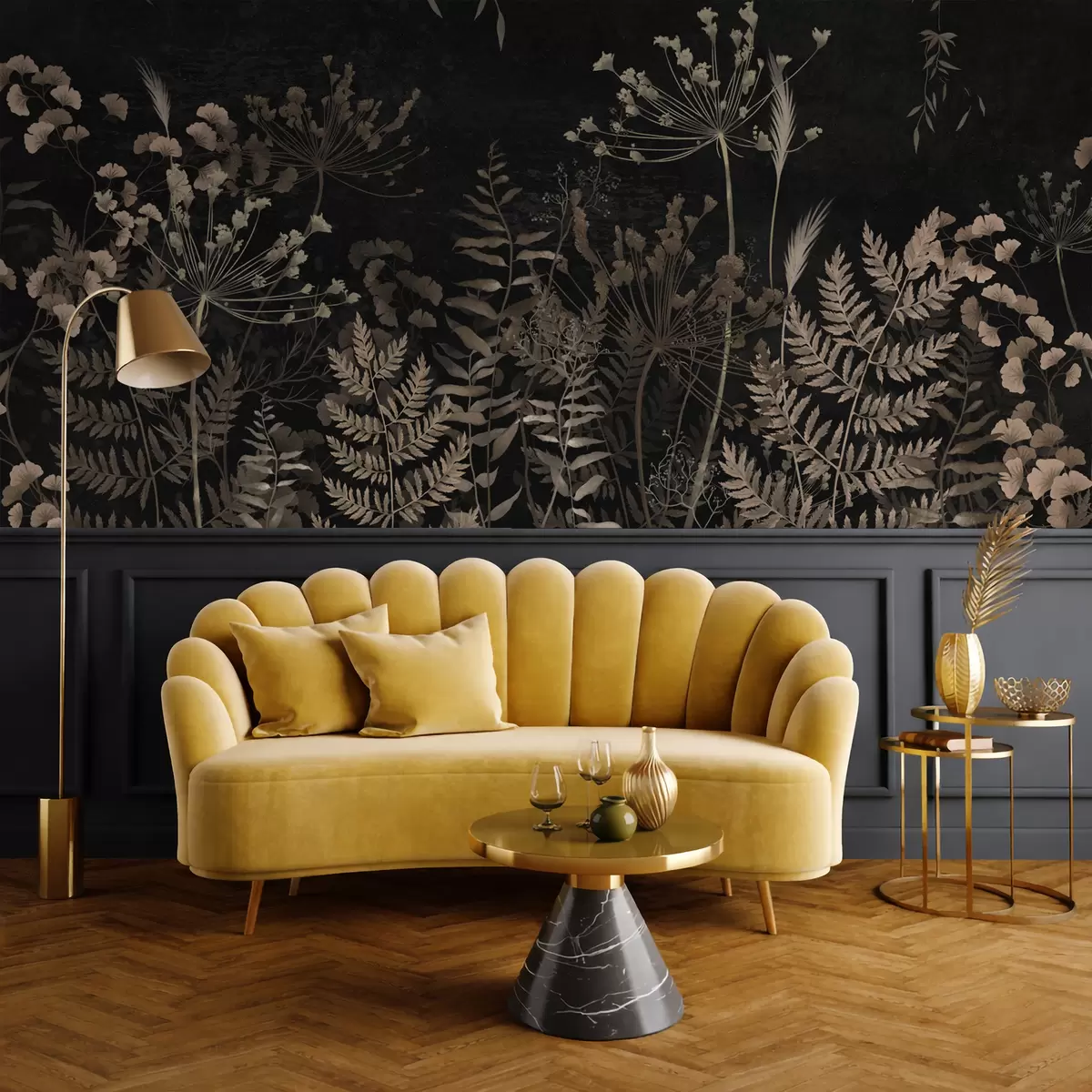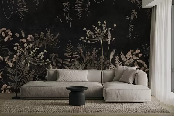 Dark botanical pattern with flowers and leaves - Wall mural (No. w05092)