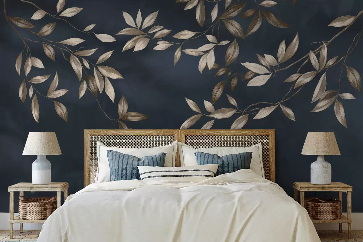 Decorative leafy branches on a deep blue background - Wall mural (No. w05113v1)
