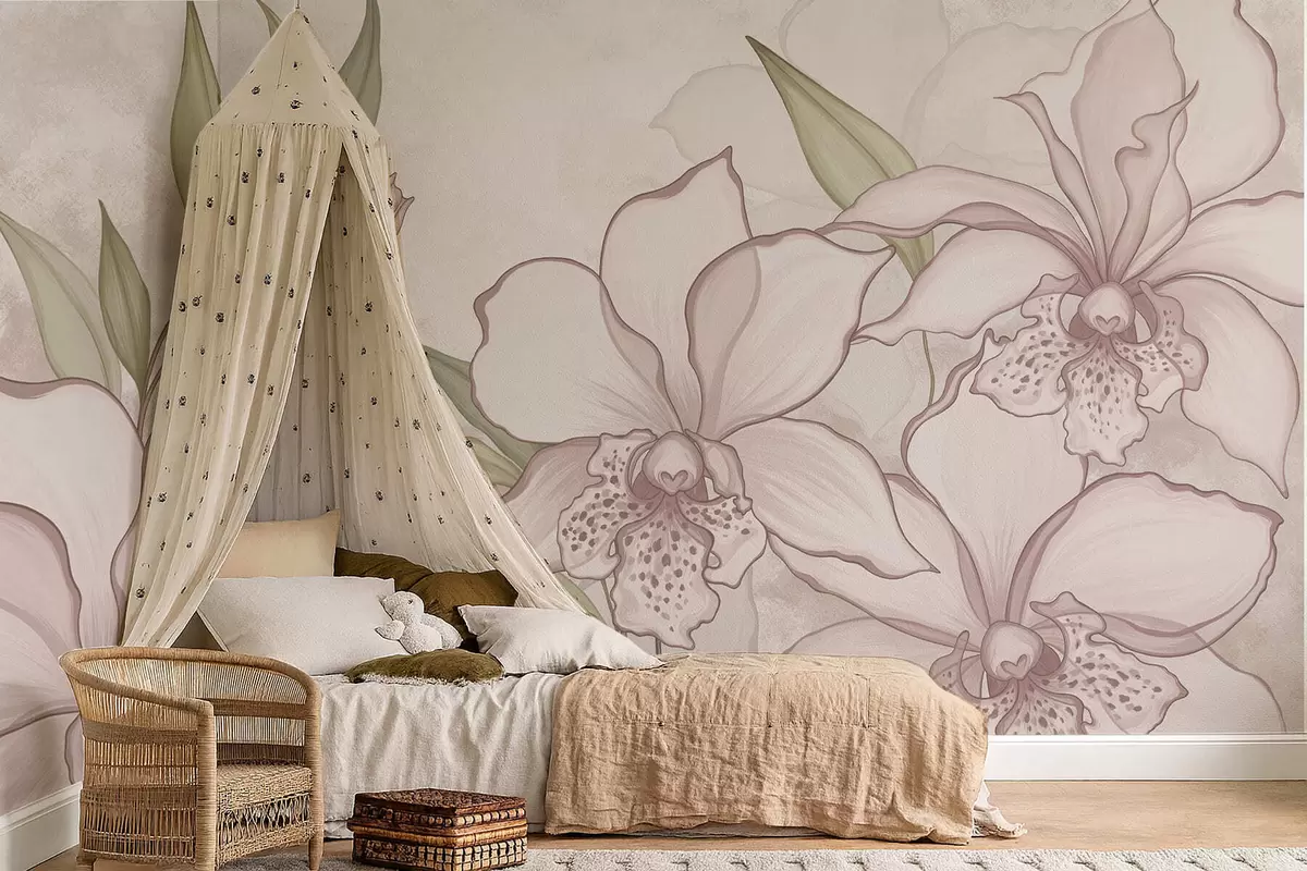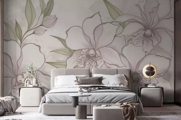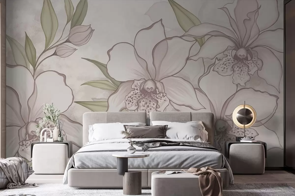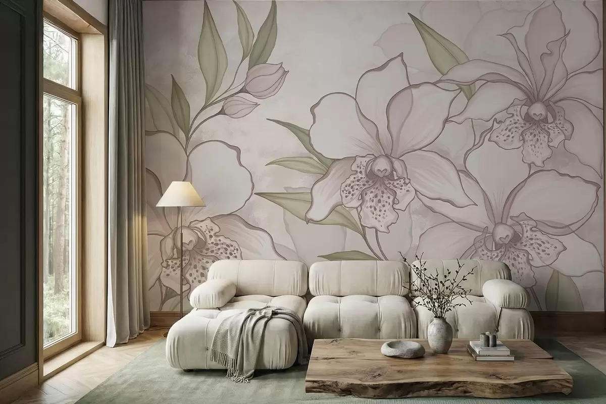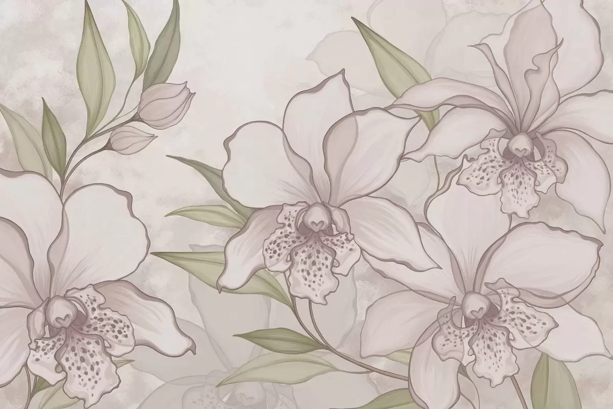Illustration of pale orchids with leaves on beige background - Wall mural (No. w05117)