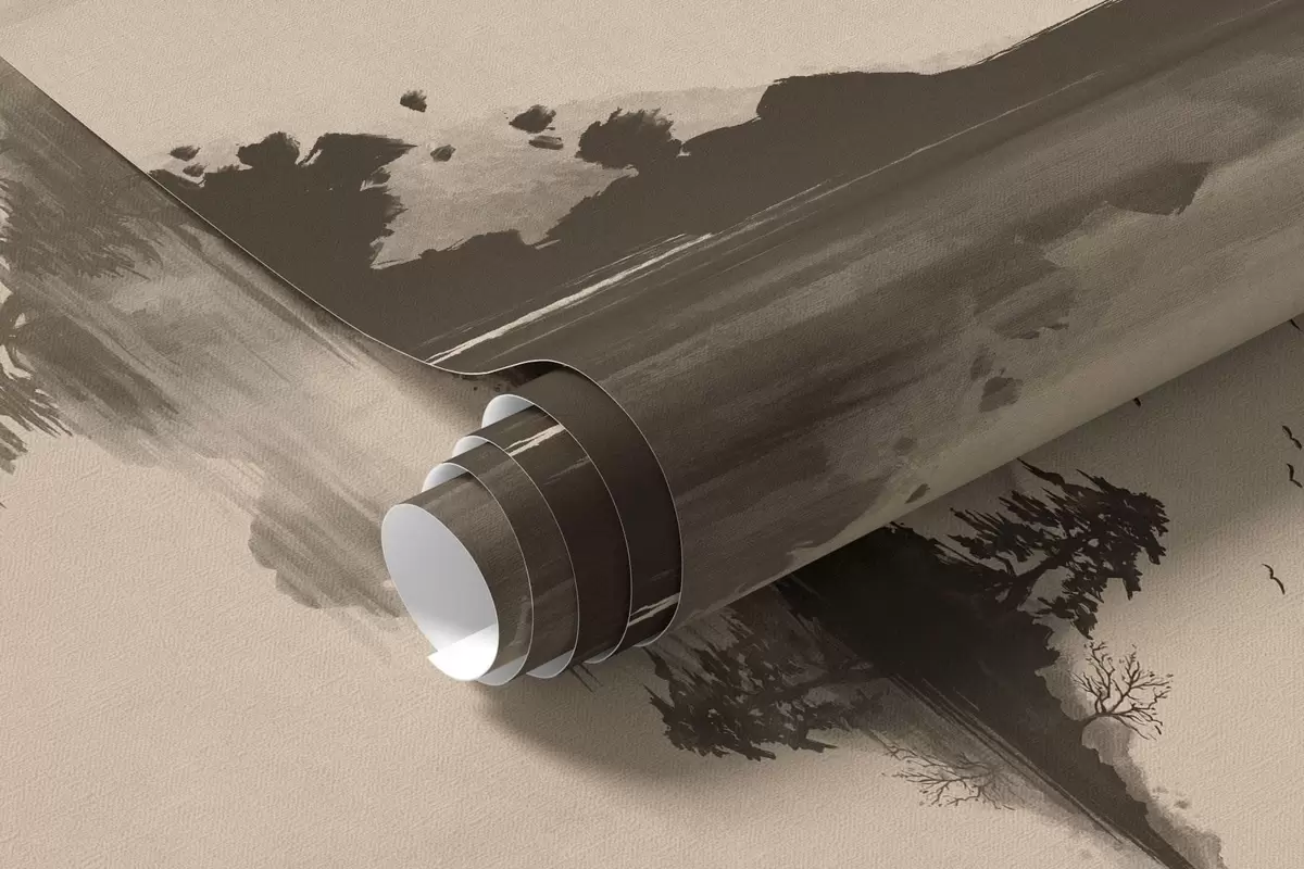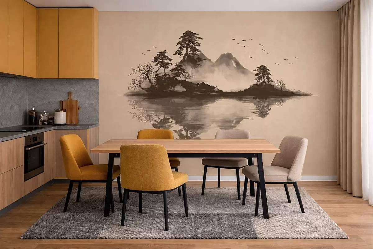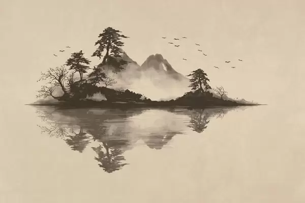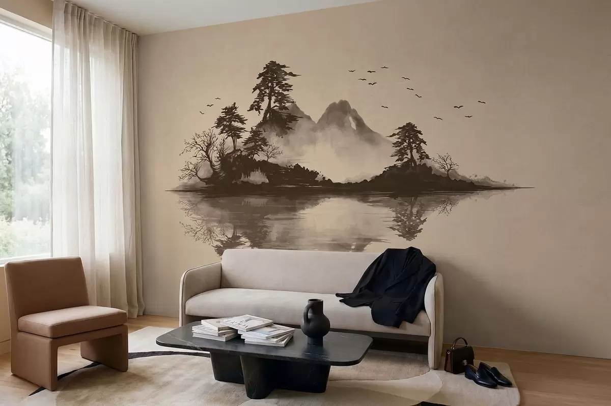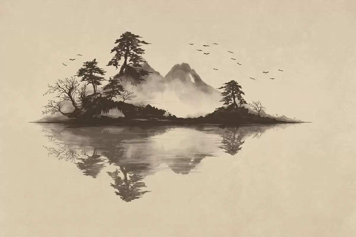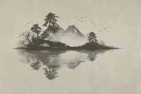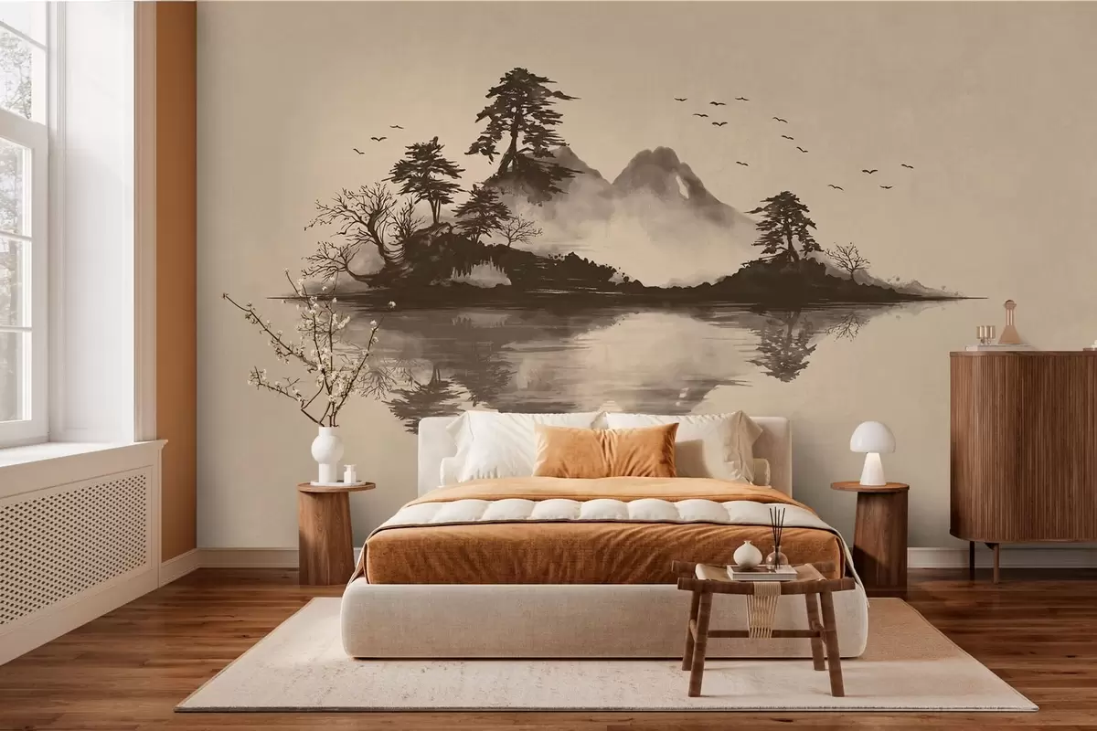 Sumi-e mountain landscape with pines and reflection - Wall mural (No. w05124)