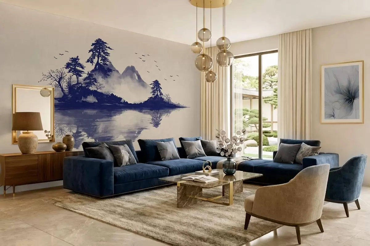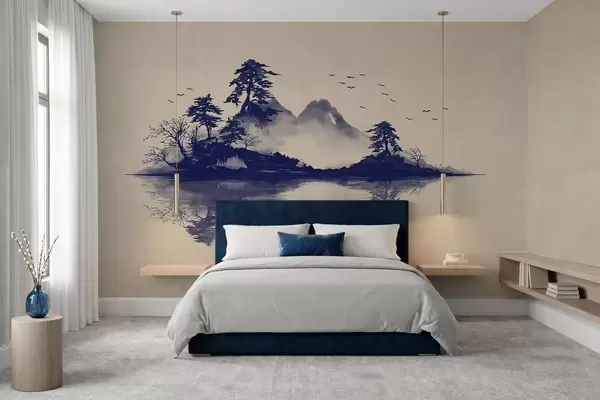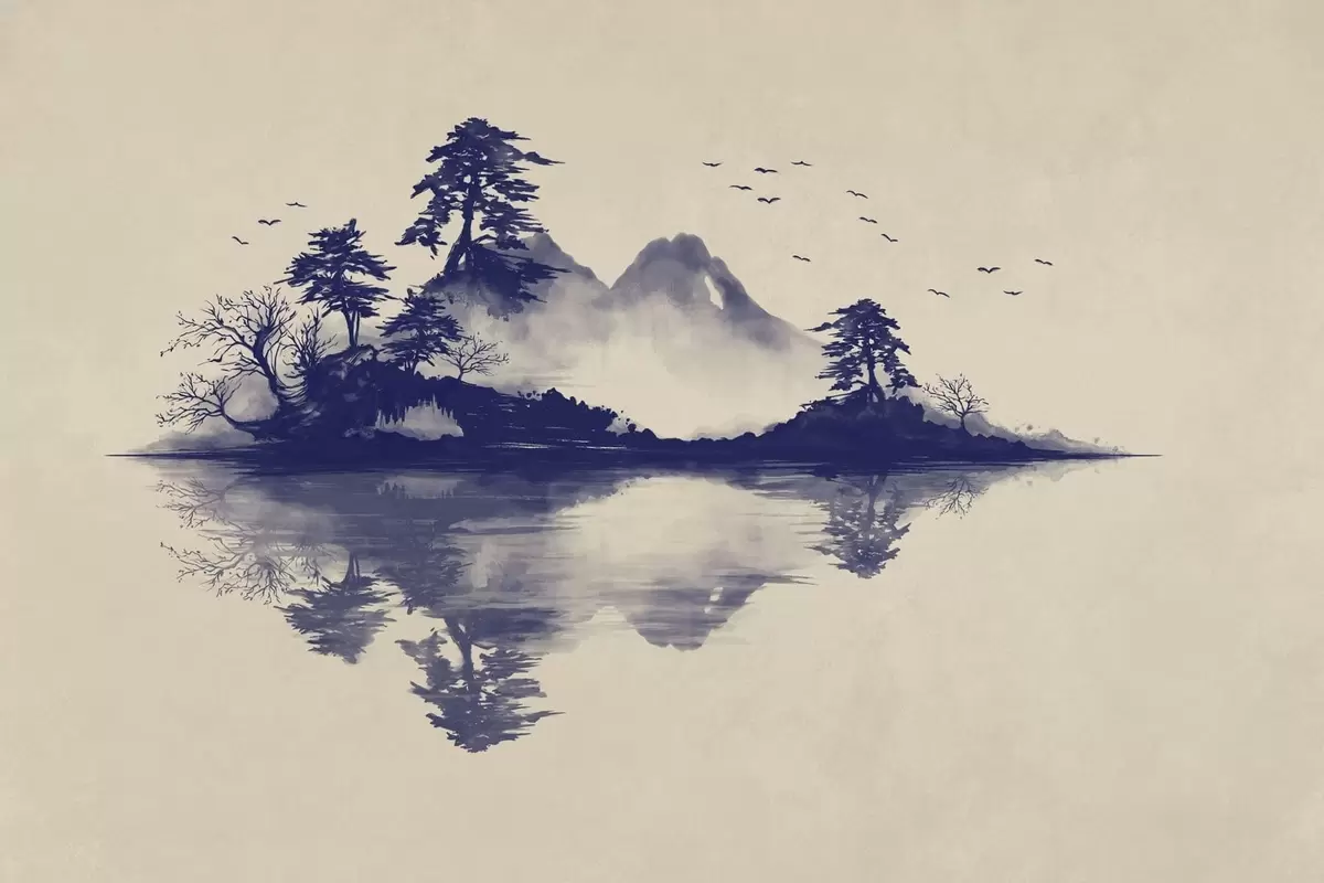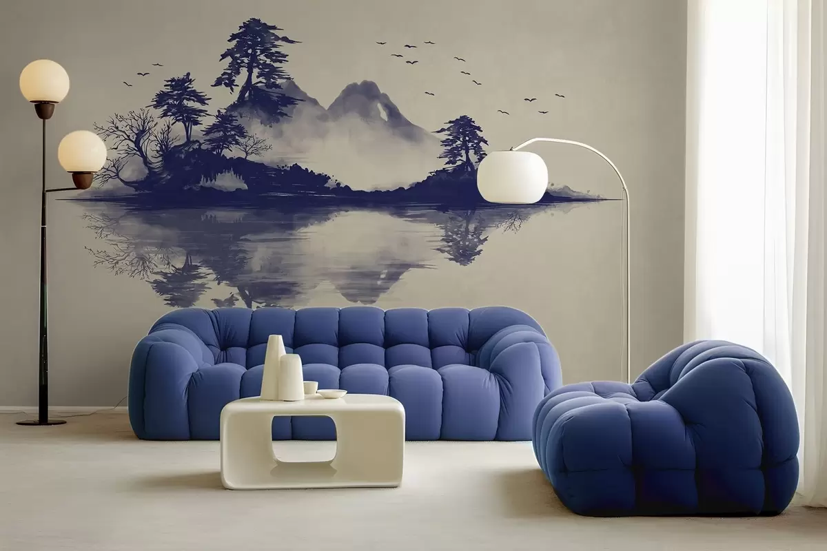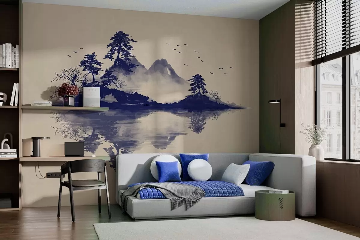 Sumi-e mountain landscape in blue tones - Wall mural (No. w05124v2)