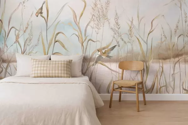 Illustration of reeds and birds by water in soft tones - Wall mural (No. w05125)