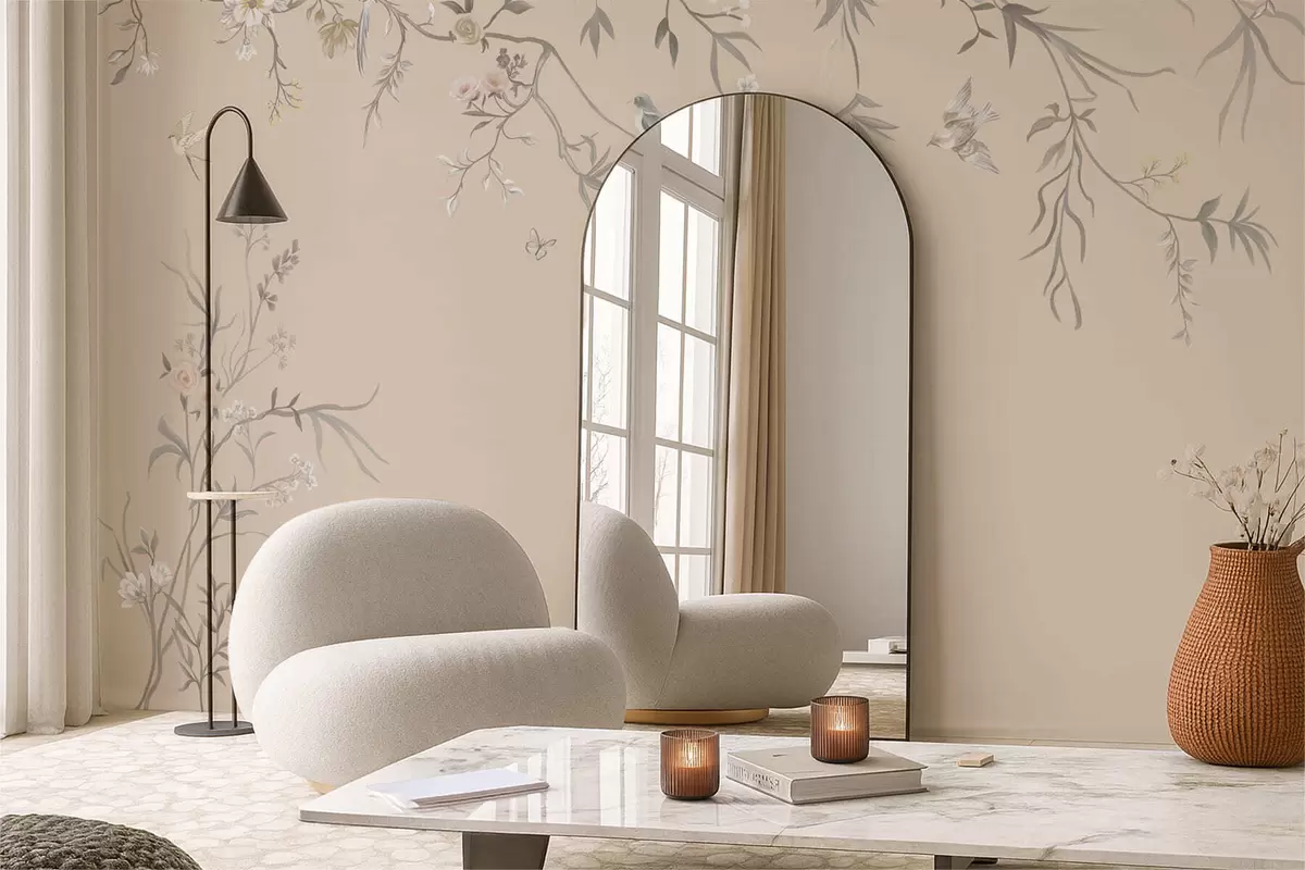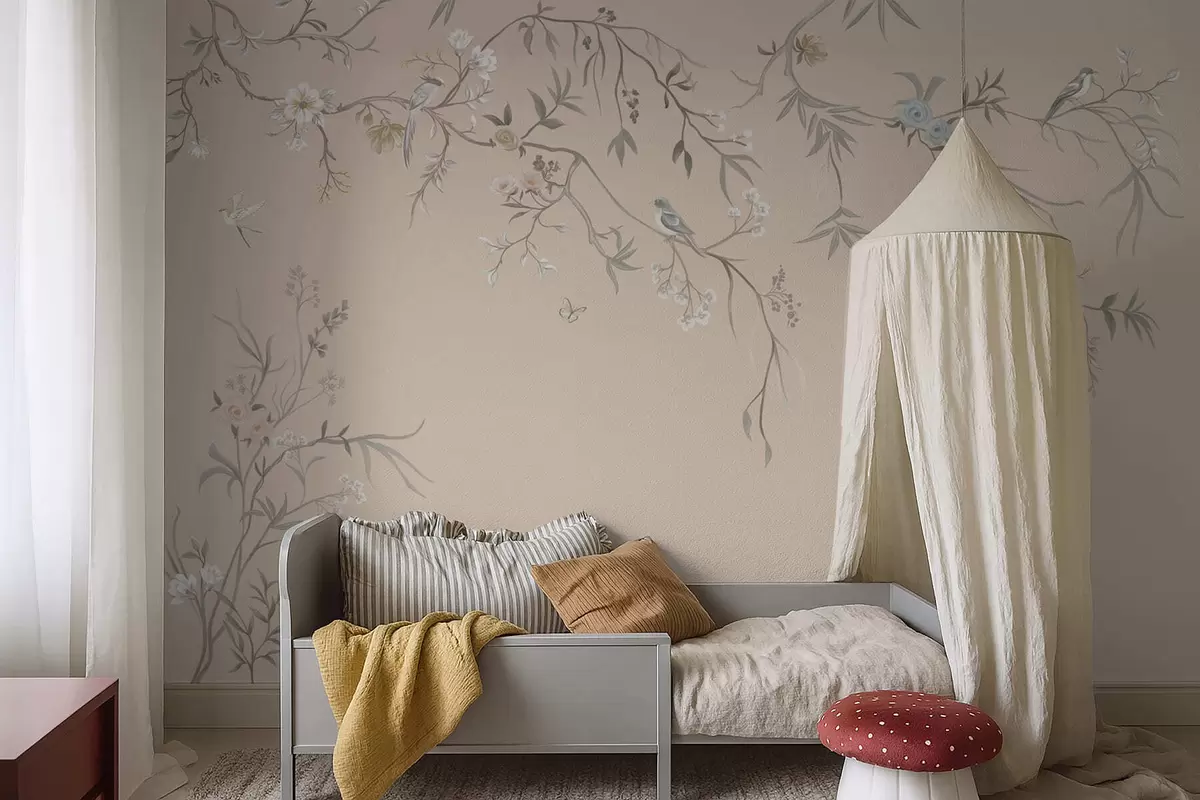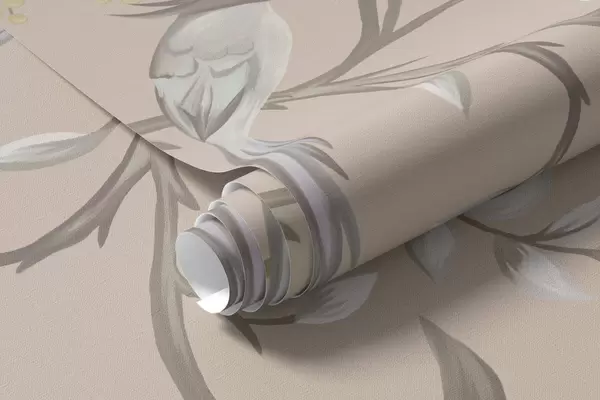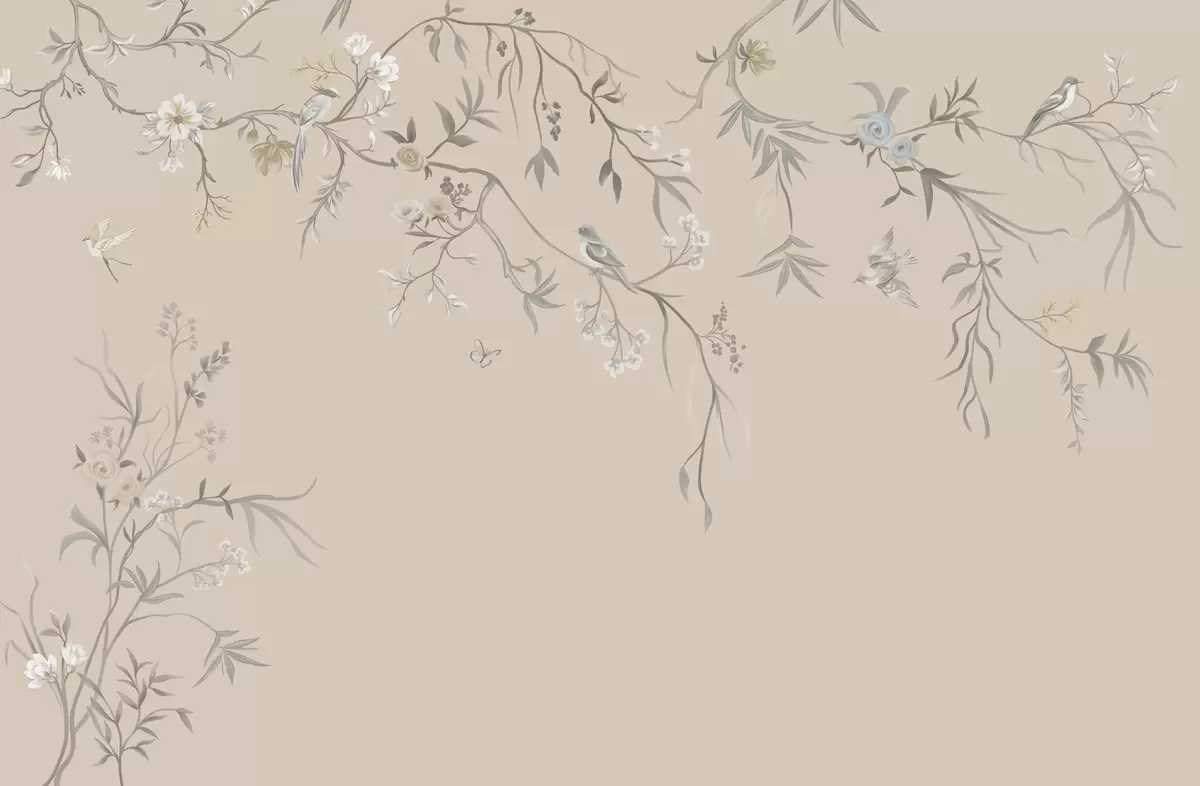 Floral branches with birds on warm beige background - Wall mural (No. w05127v1)