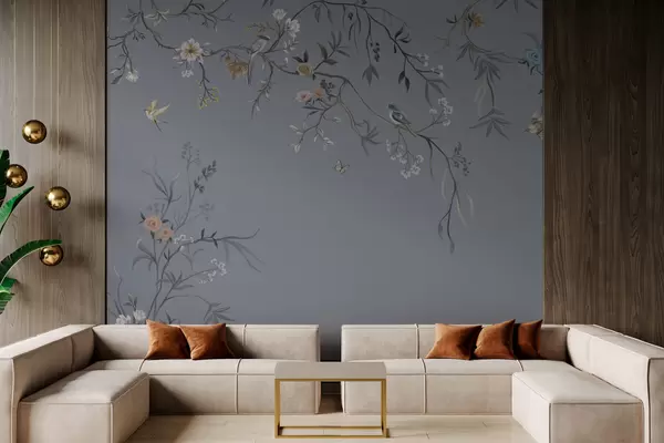Floral branches with birds on greenish background - Wall mural (No. w05127v5)