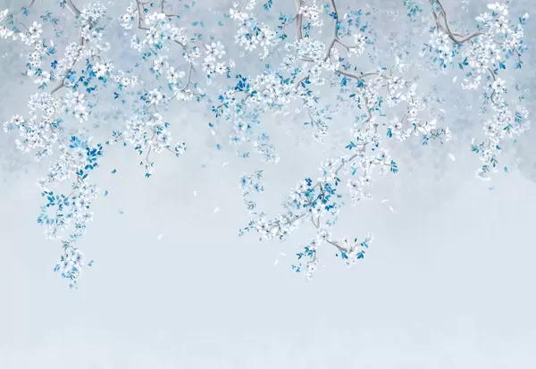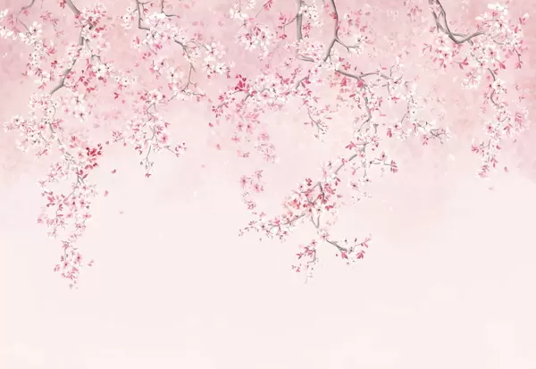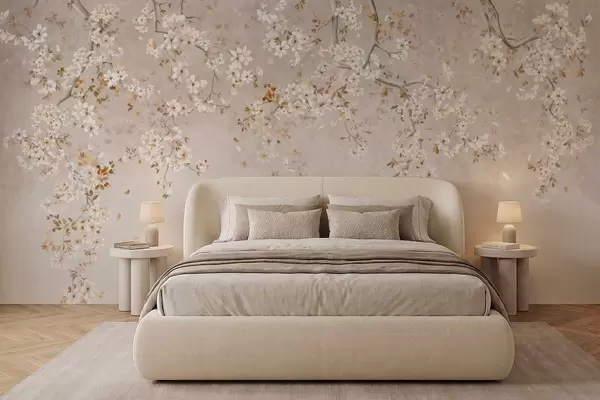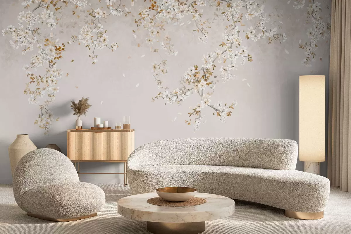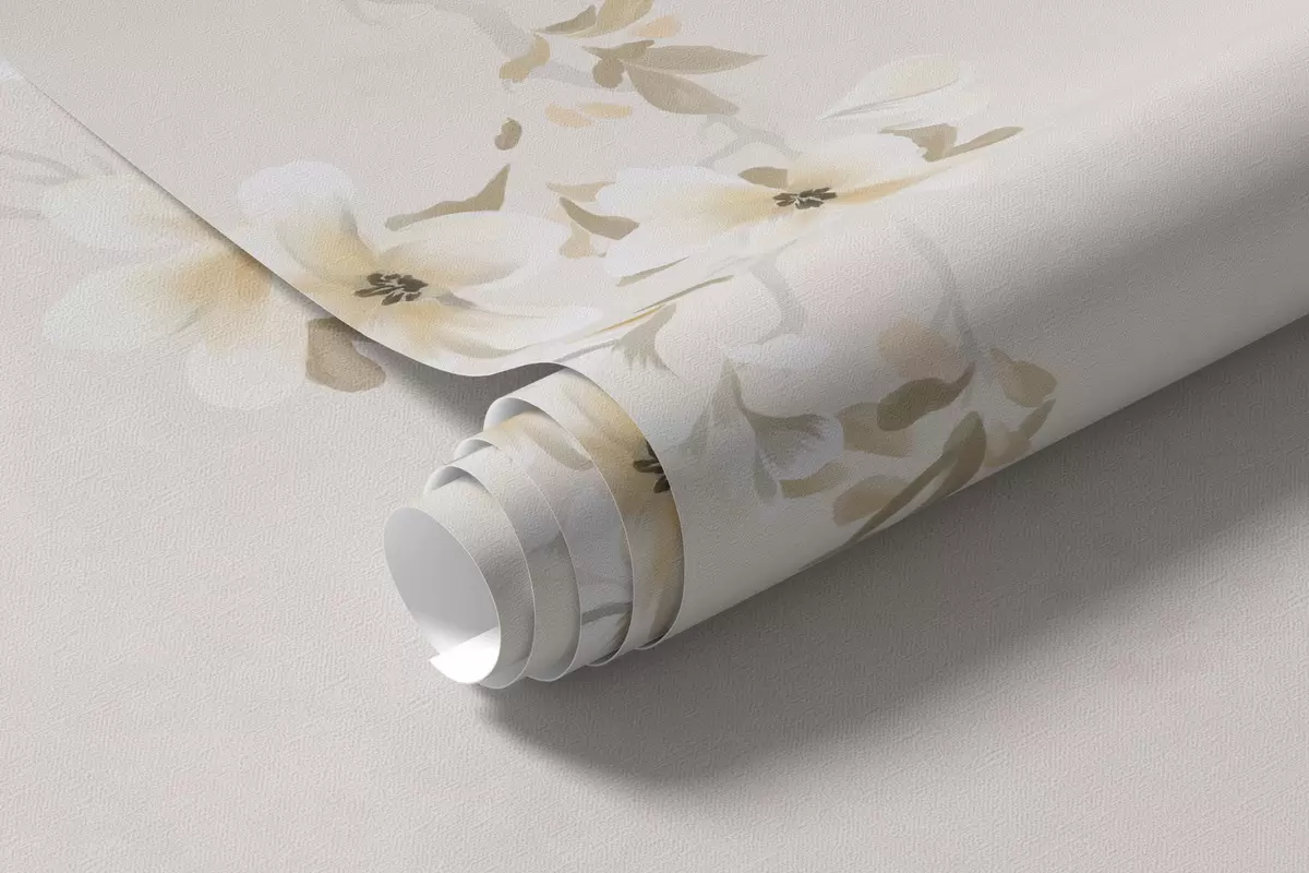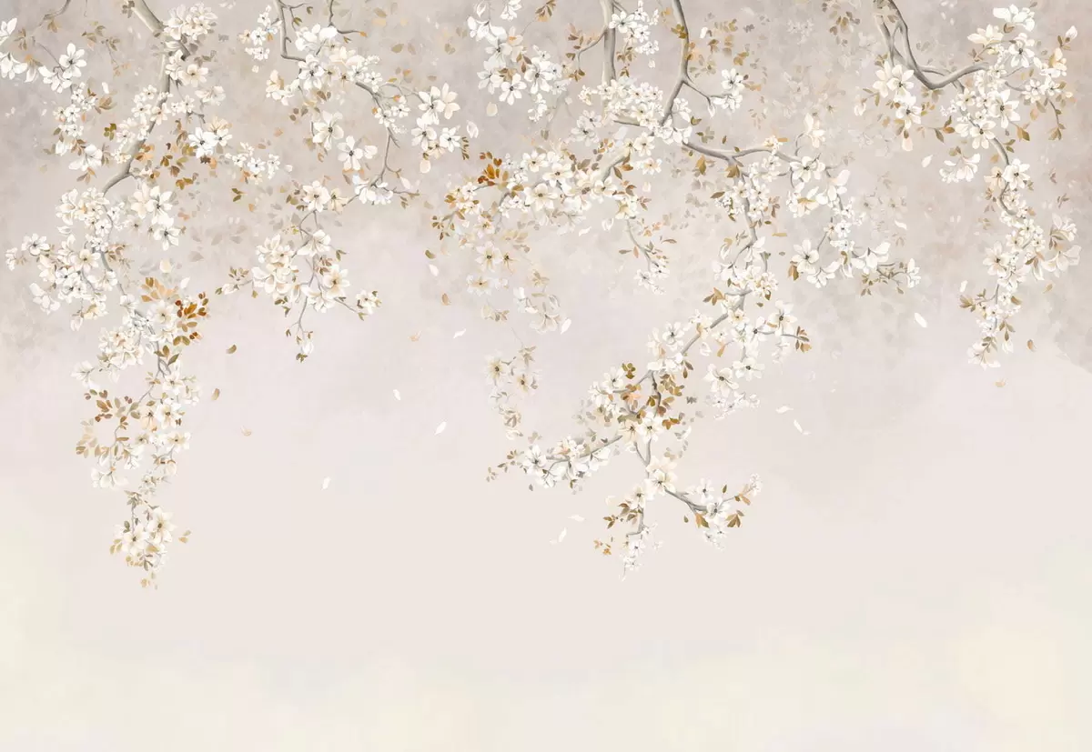 Branches with white blossoms on a soft beige background - Wall mural (No. w05129)