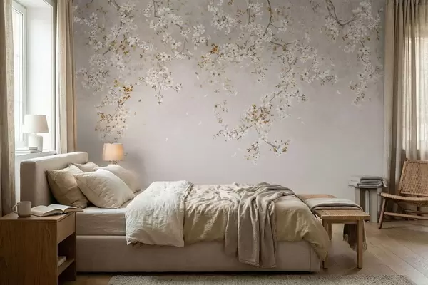 Branches with white blossoms on a soft beige background - Wall mural (No. w05129)