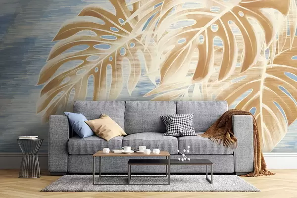 Leaves in light sandy tones on a blue background - Wall mural (No. w05130v1)