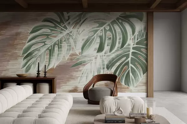Green leaves on a warm textured abstract base - Wall mural (No. w05130v3)
