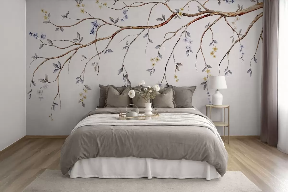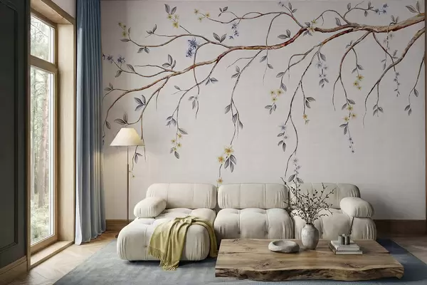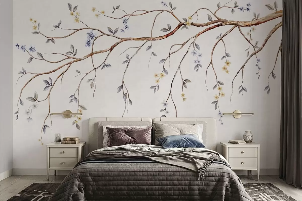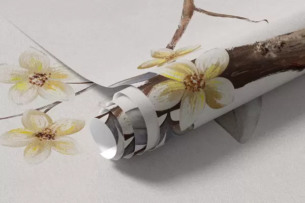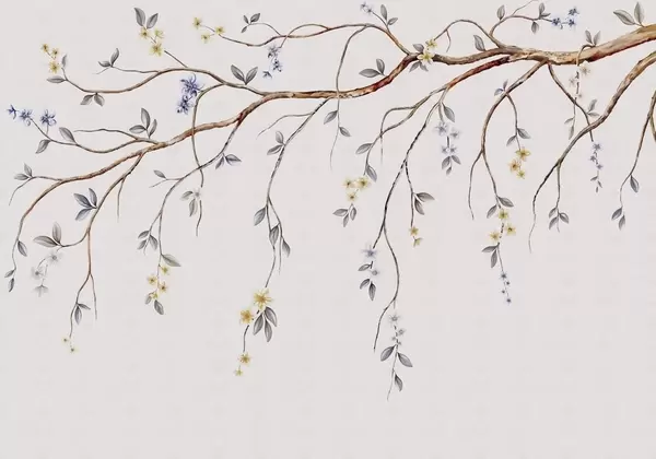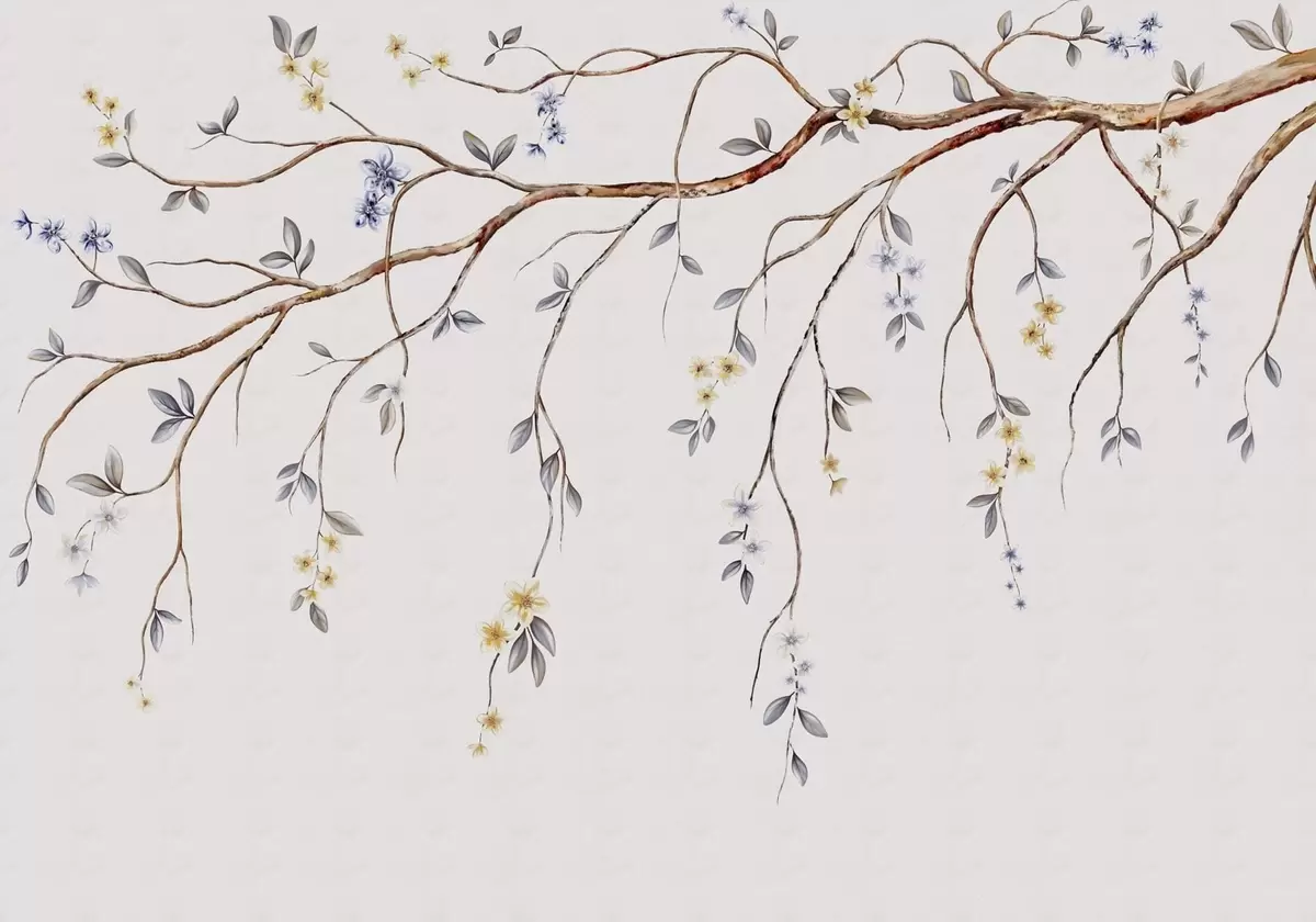 Thin branches with small flowers on light background - Wall mural (No. w05145)