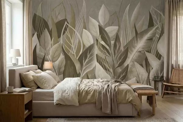 Abstract leaves in beige and green tones - Wall mural (No. w05148)