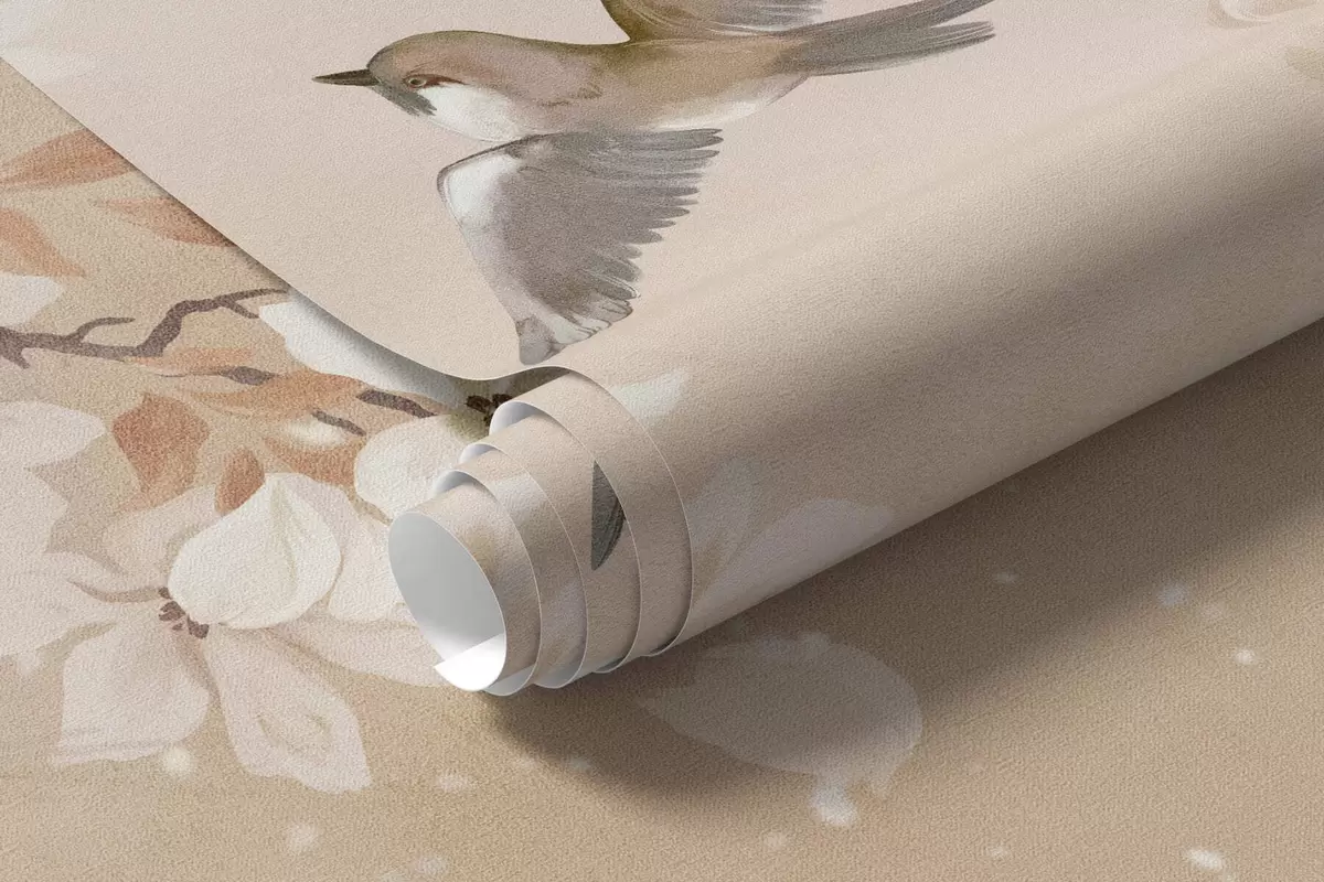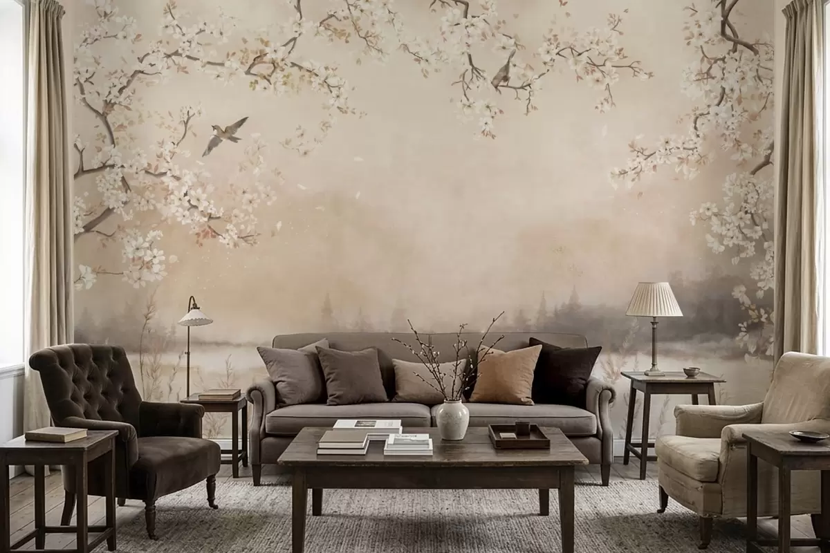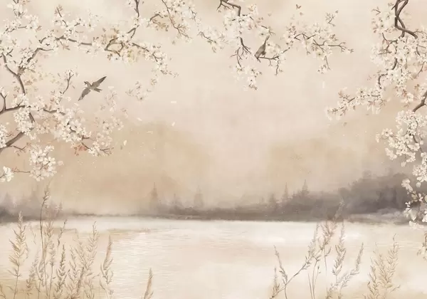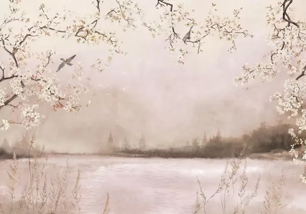Delicate blooming branches by lake with birds in light mist - Wall mural (No. w05155)