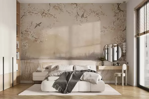 Delicate blooming branches by lake with birds in light mist - Wall mural (No. w05155)