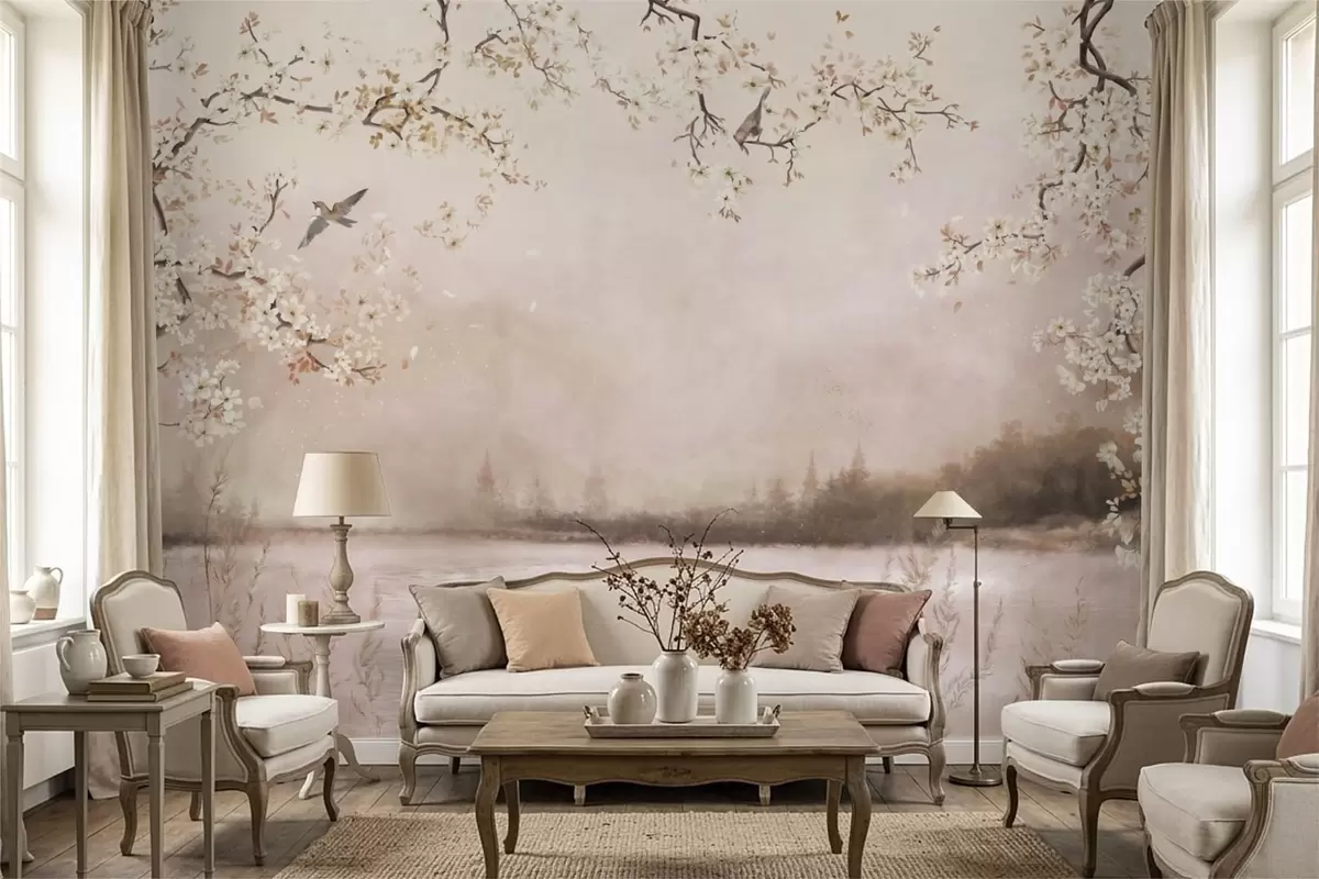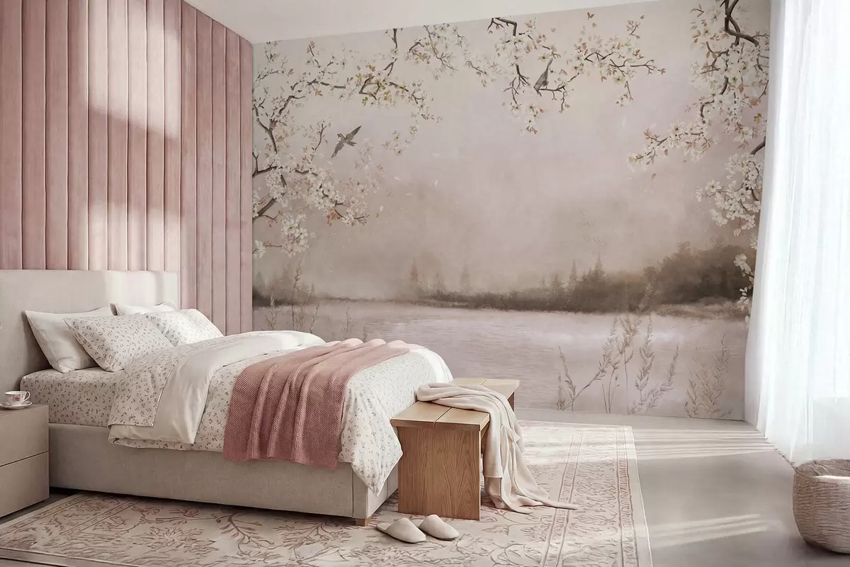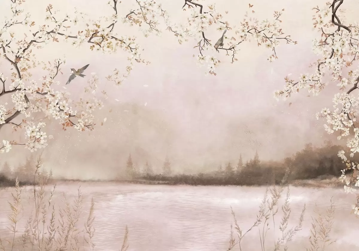 Blooming branches above calm lake with birds in mist - Wall mural (No. w05155v1)