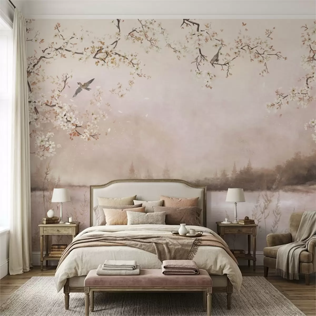 Blooming branches above calm lake with birds in mist - Wall mural (No. w05155v1)