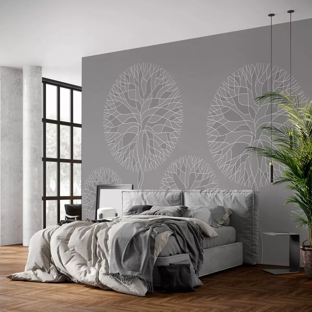Fantasy linear trees with lush crowns in medium grey tones - Wall mural (No. w05213v5)