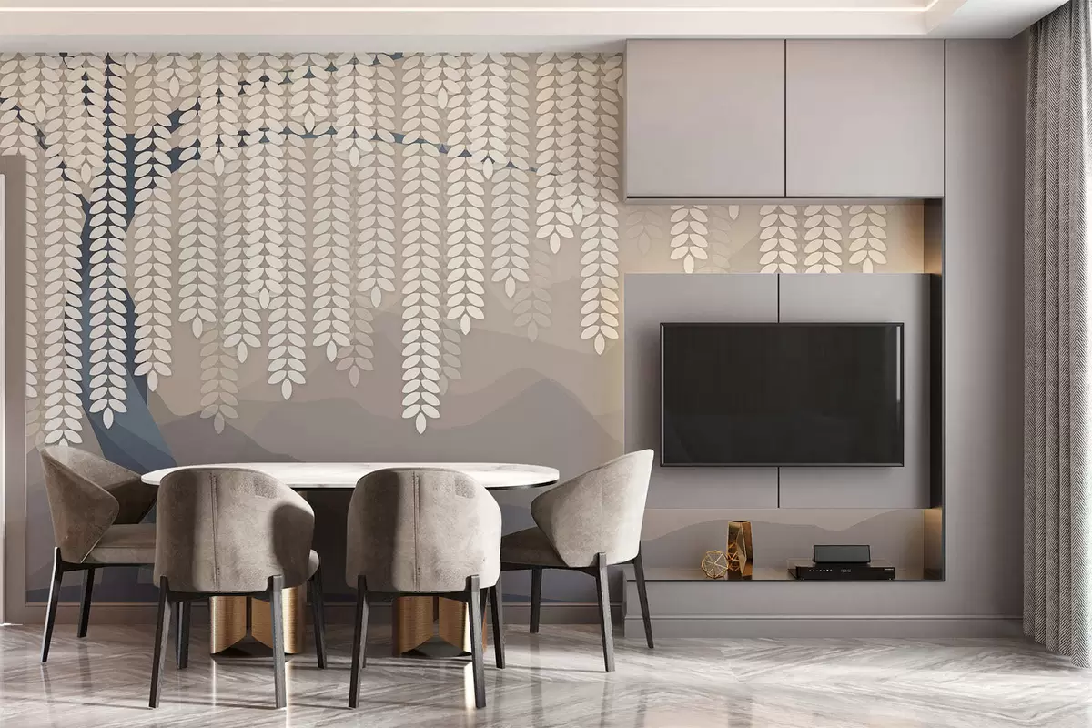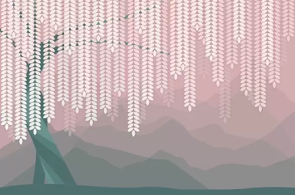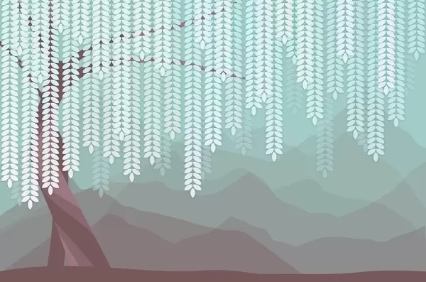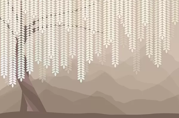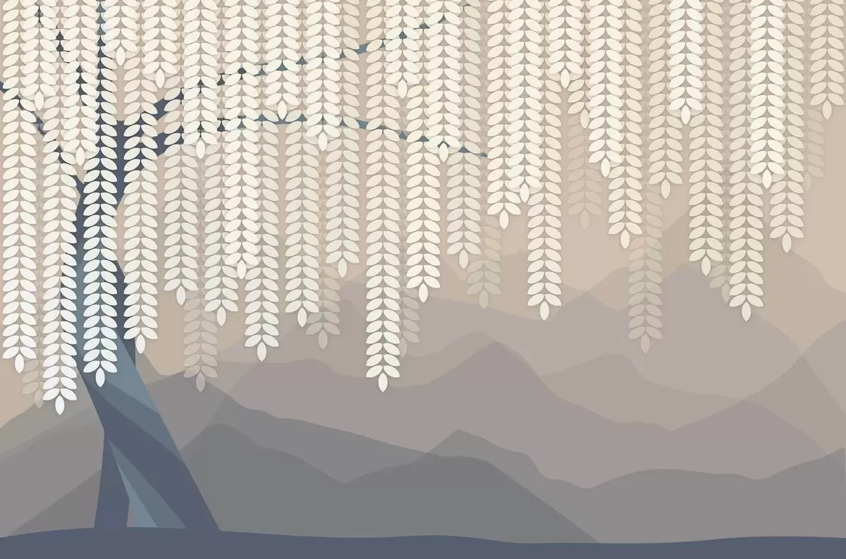 stylised willow tree with hanging leaves against a backdrop of minimalist mountains in shades of beige and blue-green - Wall mural (No. w05232)