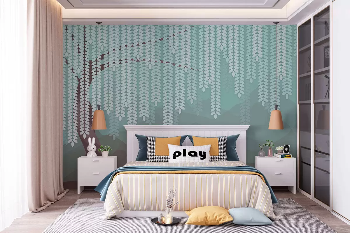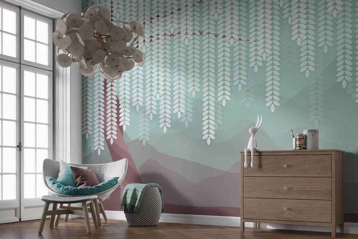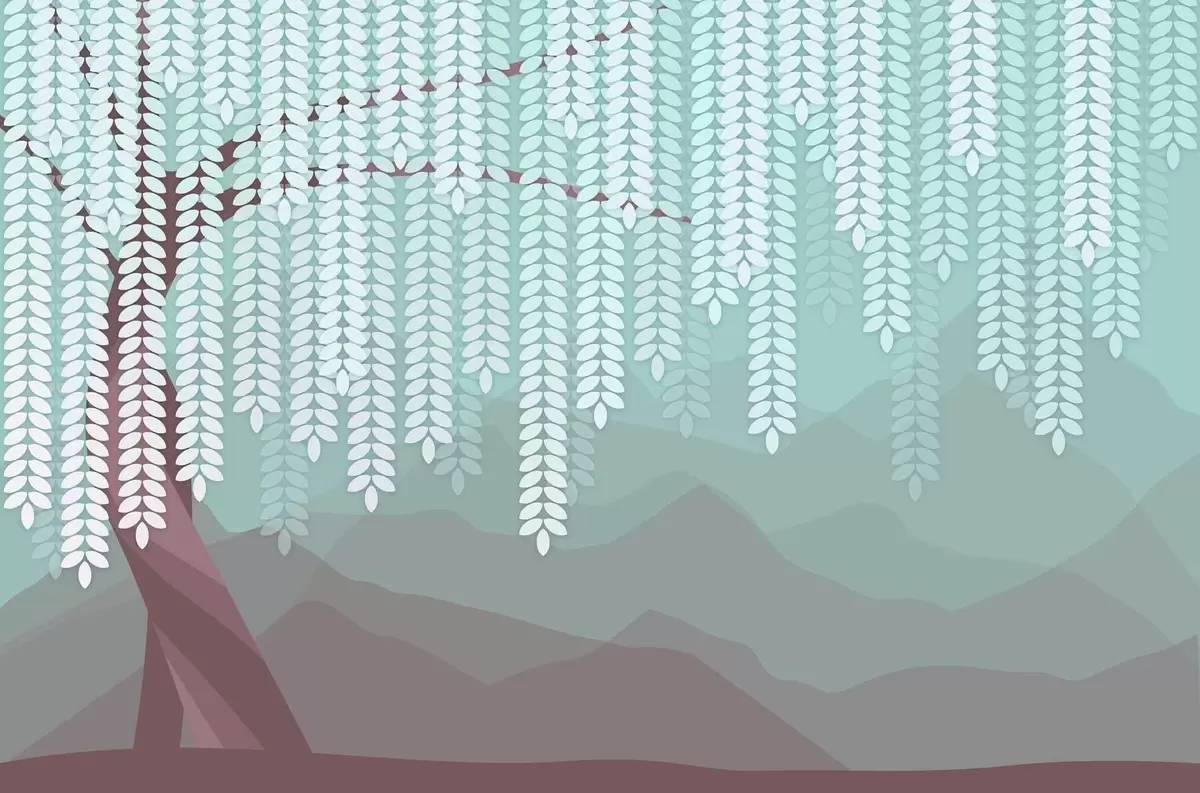stylised willow tree with hanging leaves against a backdrop of minimalist mountains in shades of chocolate and turquoise - Wall mural (No. w05232v1)