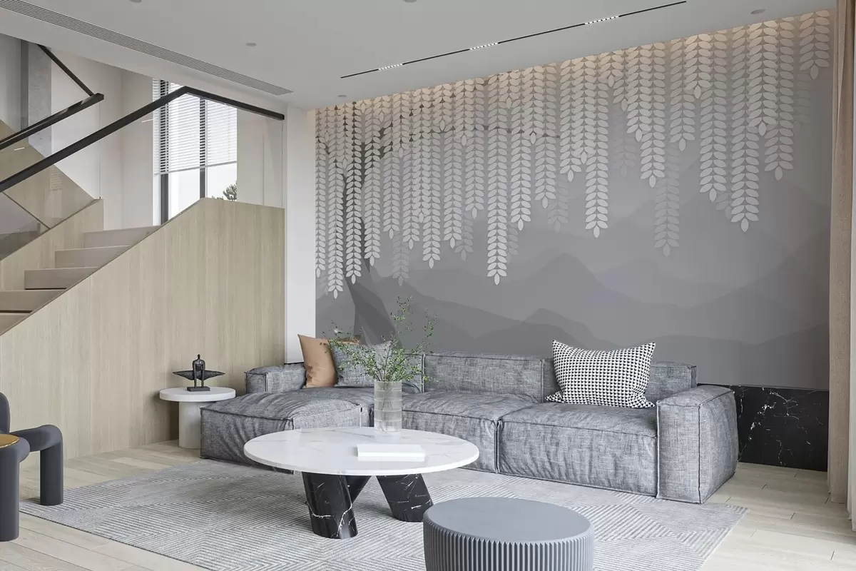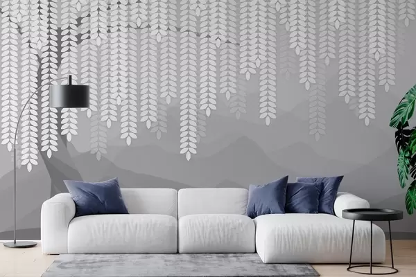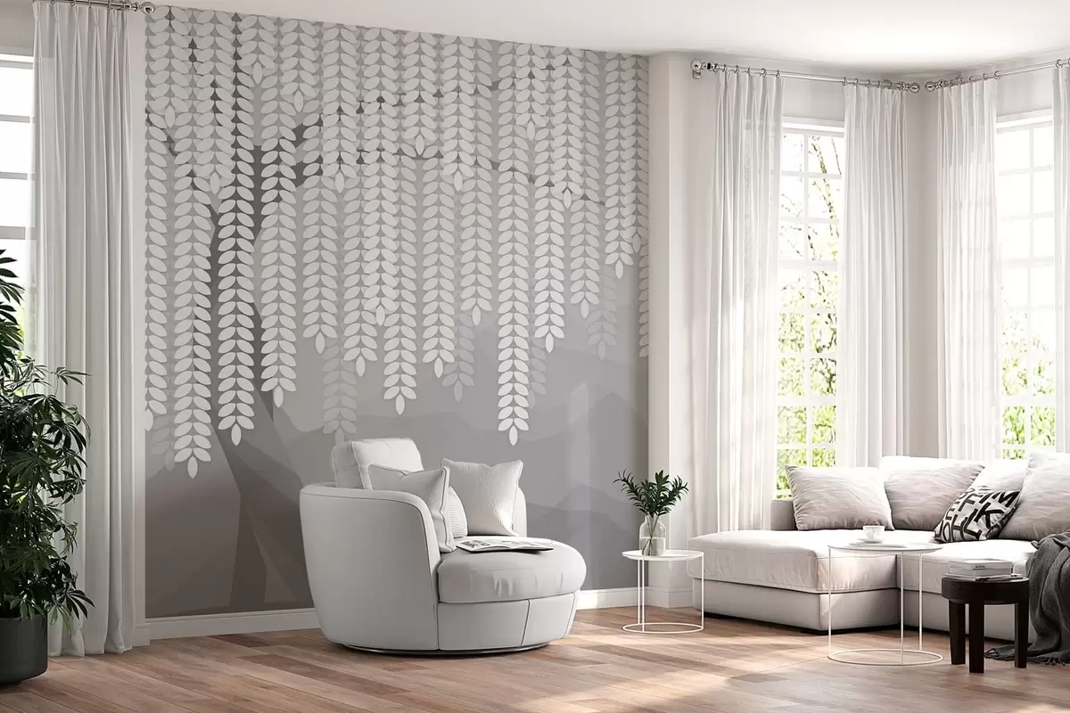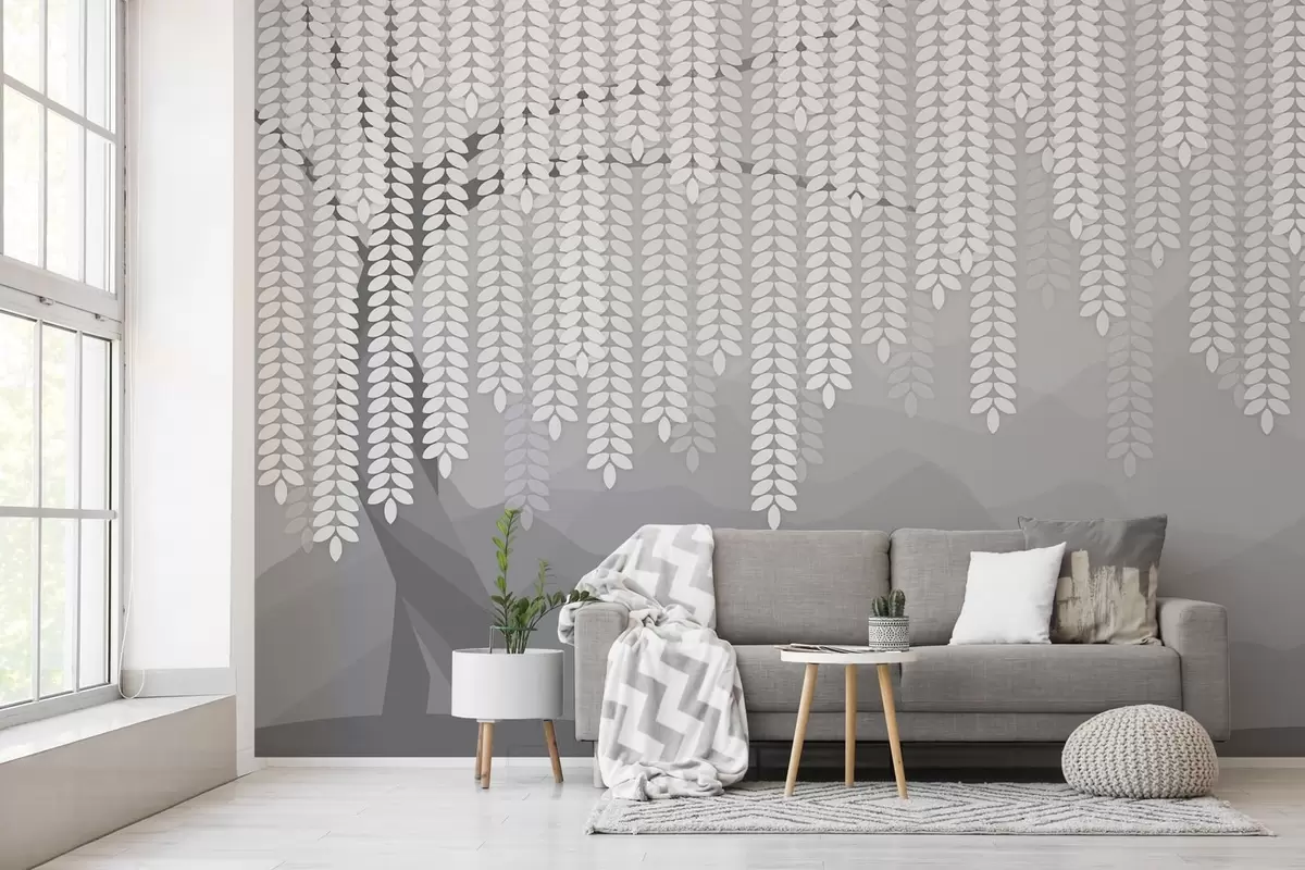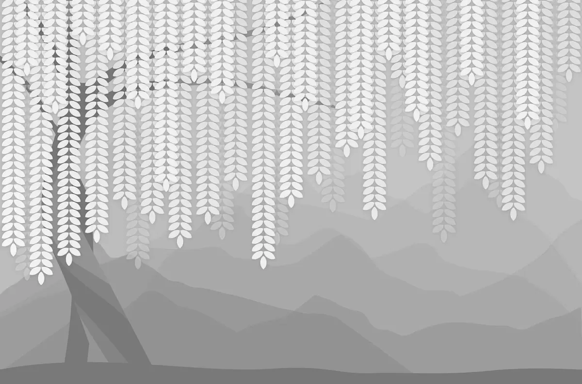 stylised willow tree with hanging leaves against a backdrop of minimalist mountains in shades of grey - Wall mural (No. w05232v3)