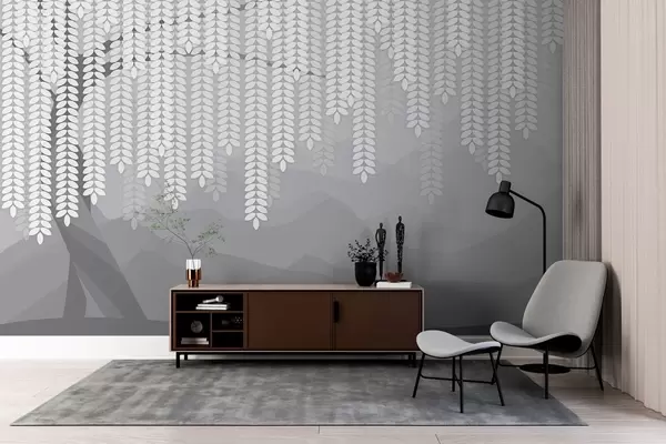 stylised willow tree with hanging leaves against a backdrop of minimalist mountains in shades of grey - Wall mural (No. w05232v3)