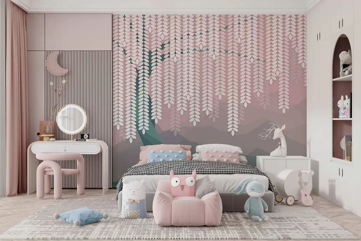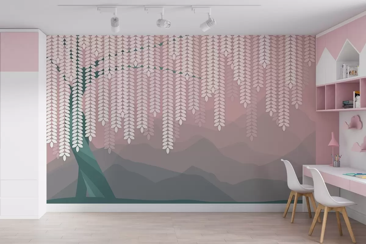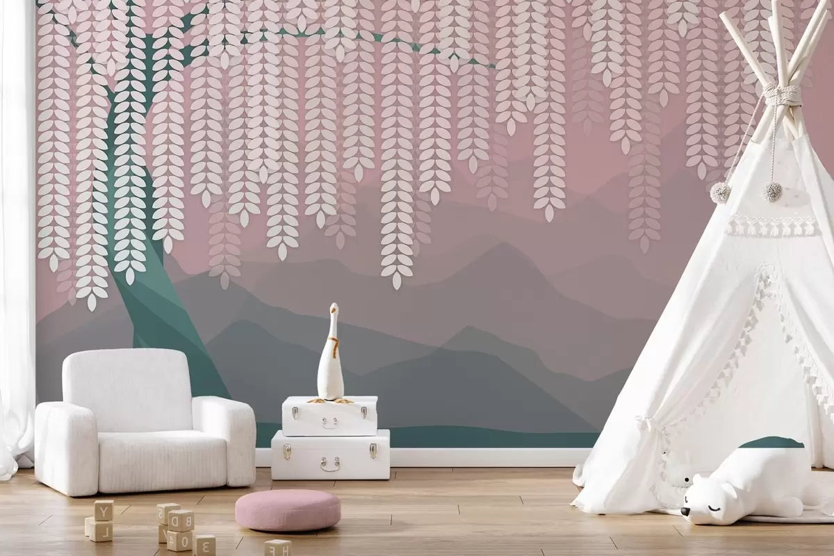 stylised willow tree with hanging leaves against a backdrop of minimalist mountains in shades of pink and dark green - Wall mural (No. w05232v4)