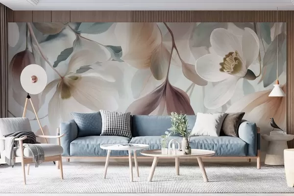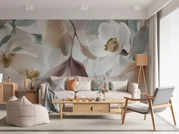 a delicate composition of flowers and leaves in pastel shades - Wall mural (No. w05240)