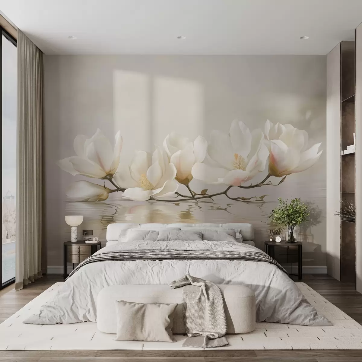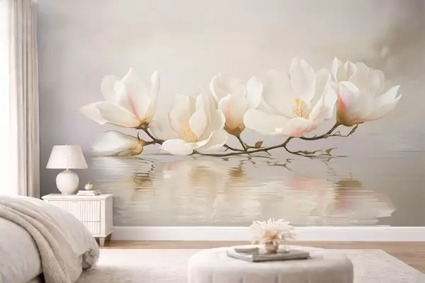 Light magnolia blossoms on branch above water reflection - Wall mural (No. w05353)