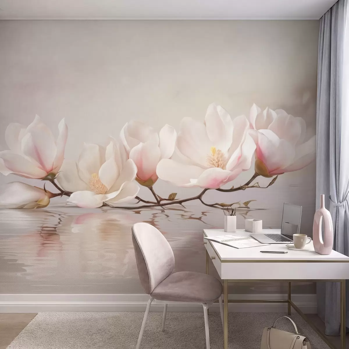 Magnolia branch with blossoms above calm water reflection - Wall mural (No. w05353v1)