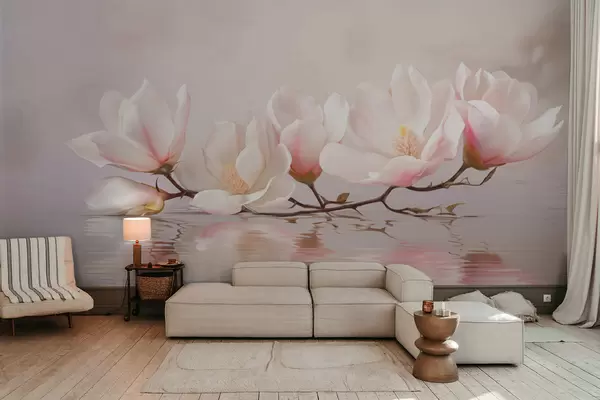 Magnolia branch with blossoms above calm water reflection - Wall mural (No. w05353v1)
