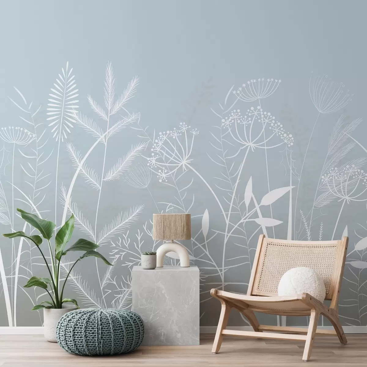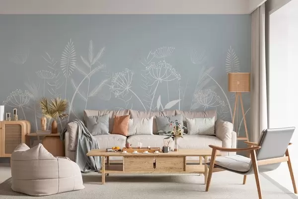 delicate hand-painted wild grasses and flowers against a grey-blue background - Wall mural (No. w05383)