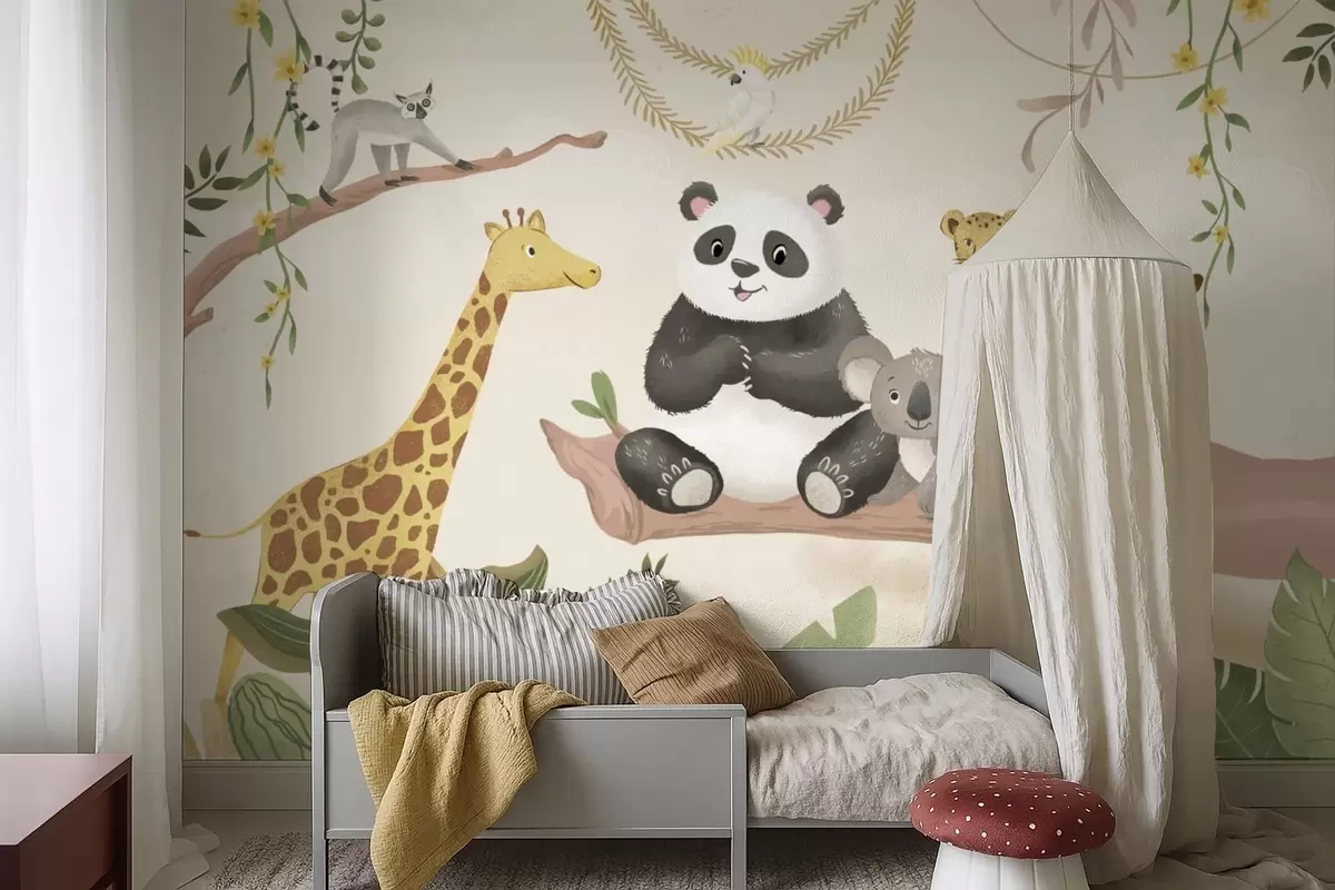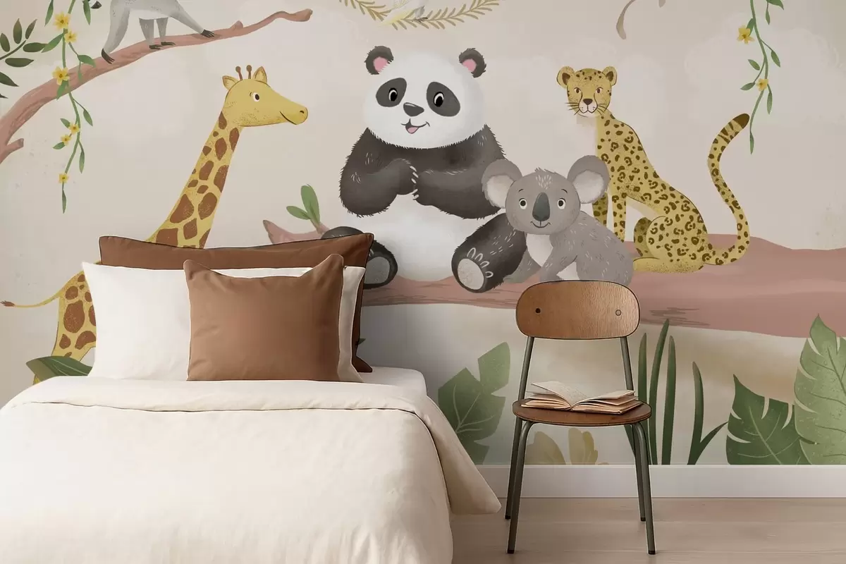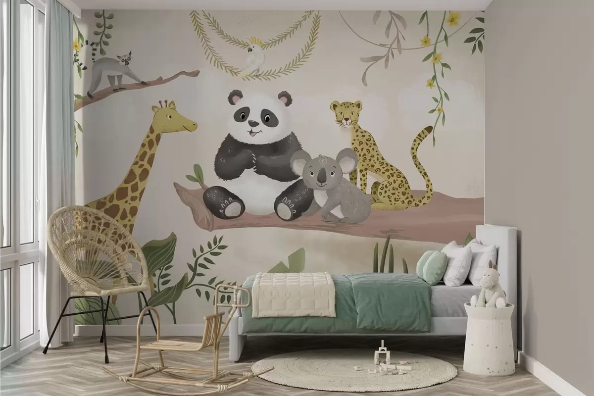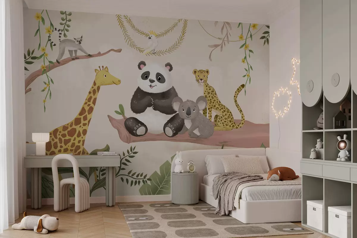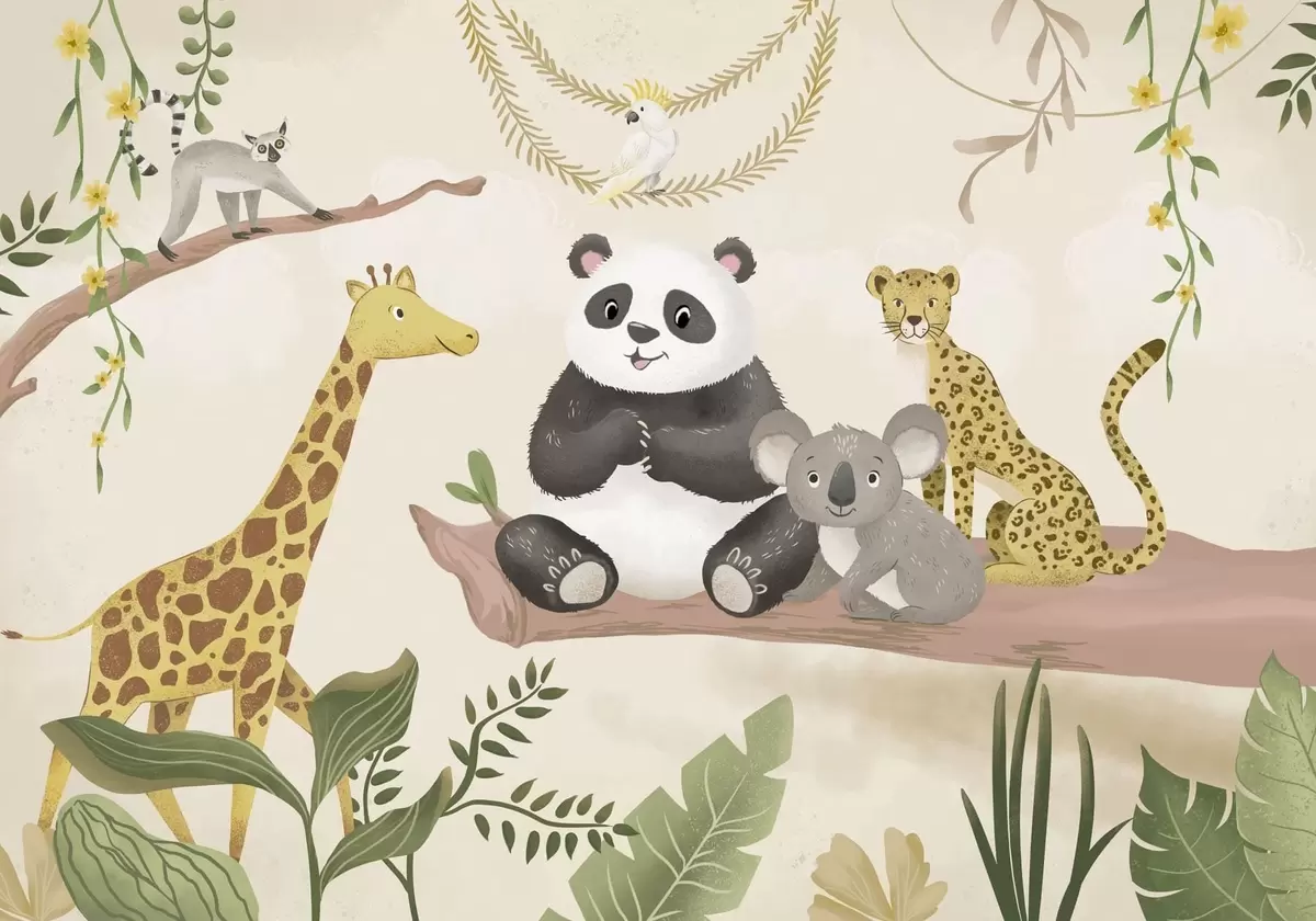 Cute jungle animals on a branch among plants - Wall mural (No. w05393)