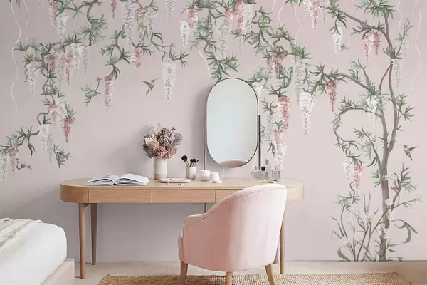 Flowering branches with pink blossoms and birds - Wall mural (No. w05394v1)